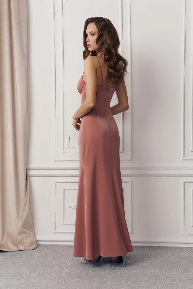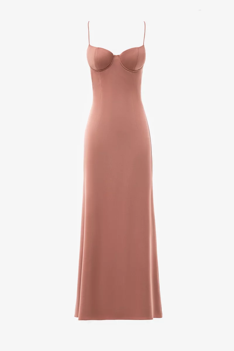 Платье макси из приятного к телу сатина с гладкой фактурой. Лиф с чашками на косточках, подчеркнутая талия и слегка расклешенный крой юбки моделируют изящный силуэт. Модель на тонких бретелях. Застёгивается на скрытую молнию сзади. На сатиновой подкладке