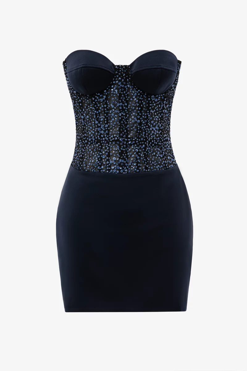 Эффектное платье мини из сетчатого материала с мерцающим декором. Корсет на косточках, лиф с сатиновыми чашками. Сатиновая юбка на подкладке. Застегивается на скрытую молнию и шнуровку сзади