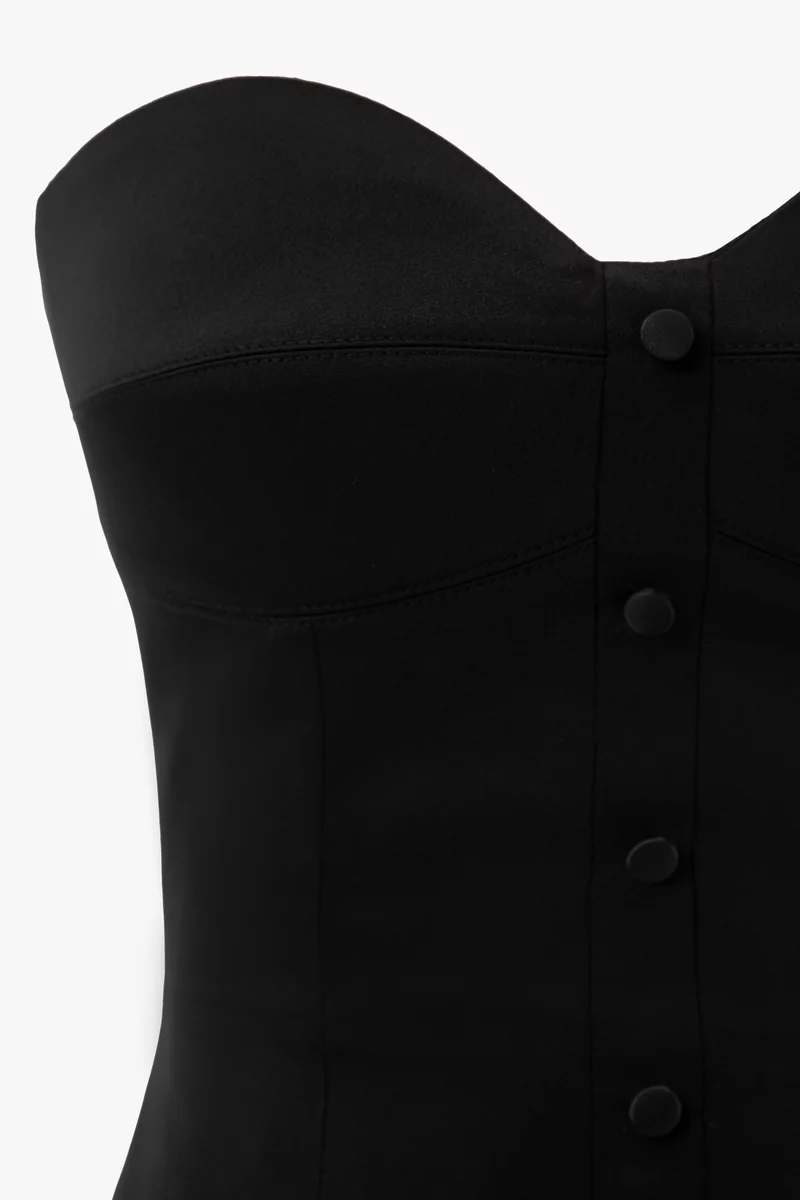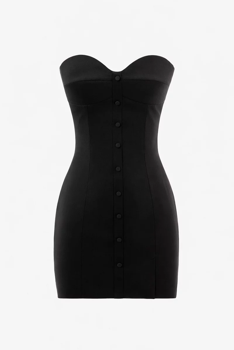 Соблазнительное платье мини с открытыми плечами. Акцентный лиф на косточках дополнительно моделирует силуэт. Платье с декоративными пуговицами спереди. Застёгивается на скрытую змейку на спинке. На подкладке
