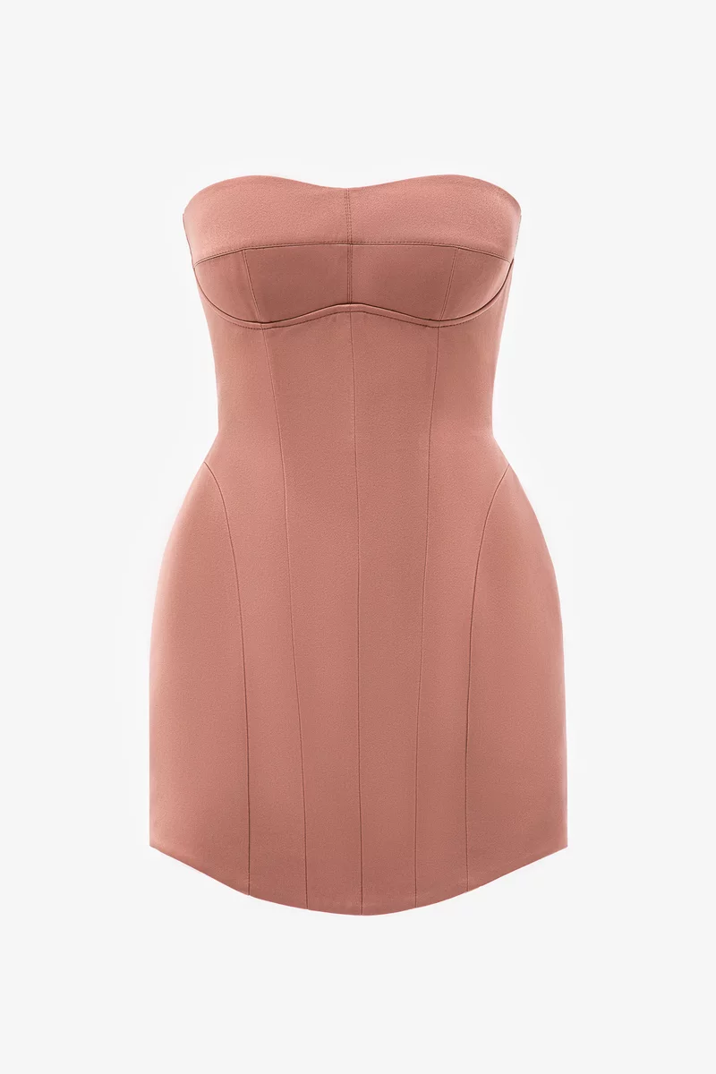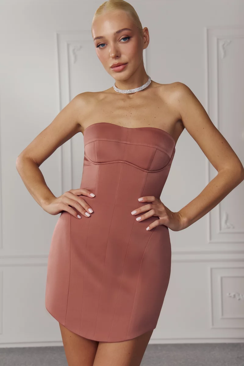 Платье мини из плотного, приятного к телу сатина с гладкой фактурой. Подчеркнутая талия и моделирующие вставки в бедрах создают соблазнительный силуэт. Платье застегивается на скрытую молнию сзади. На подкладке