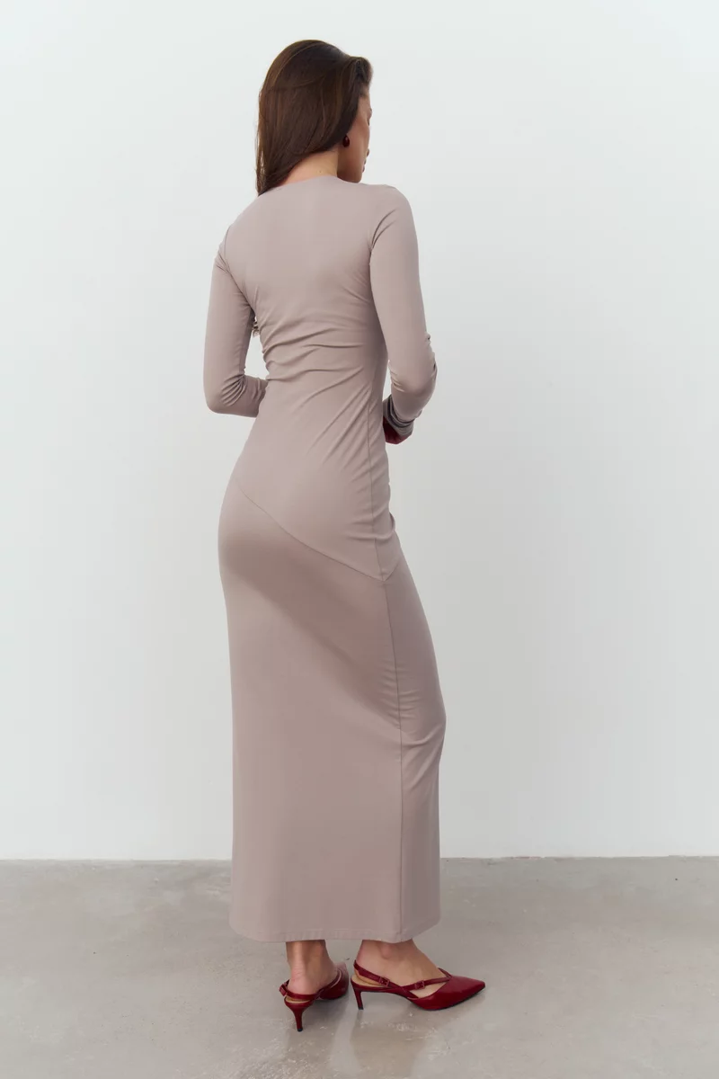 Коричневое трикотажное платье макси с длинным рукавом