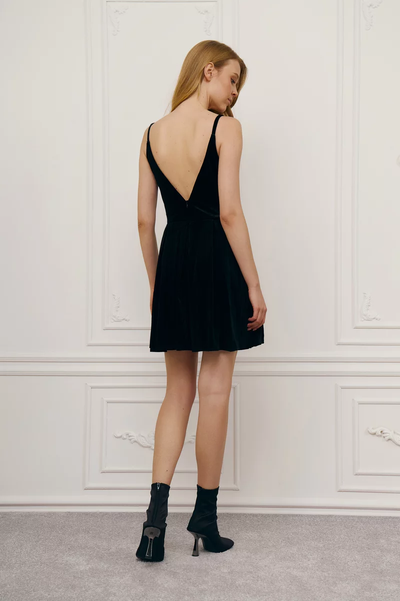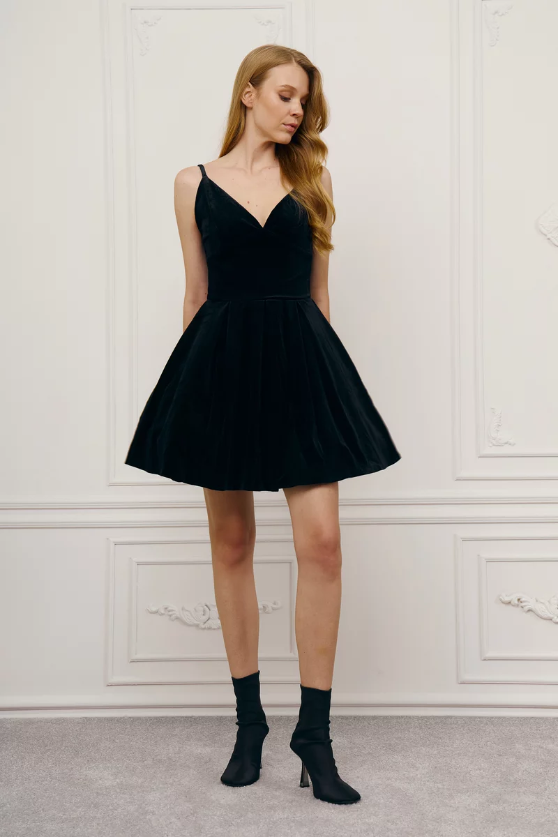 Бархатное платье мини с подчеркнутой талией и расклешенной юбкой. Застёгивается на скрытую молнию сзади