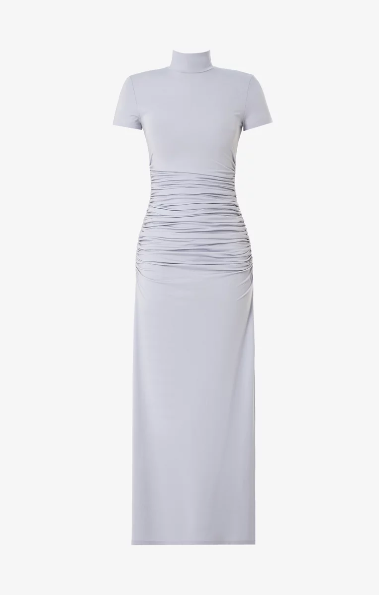 Платье макси из мягкого, приятного к телу трикотажа. Модель с воротником-стойкой, коротким рукавом и акцентной драпировкой. Платье имеет боковой разрез