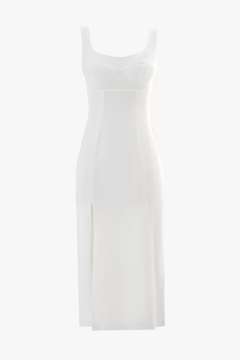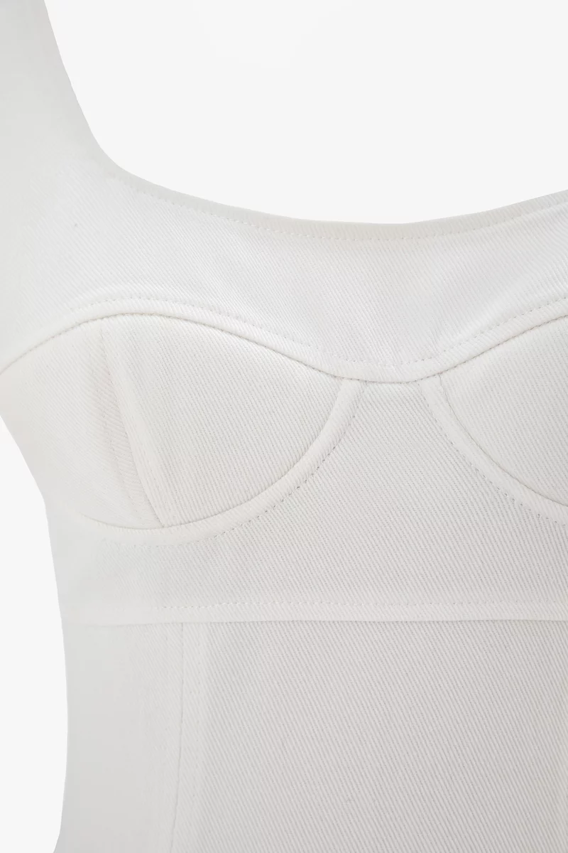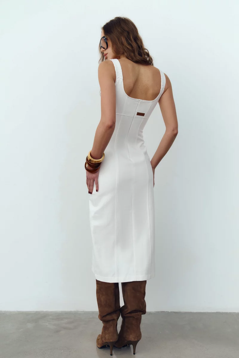 Эффектное джинсовое платье миди из плотного, но мягкого 100% коттона. Модель на бретелях с эластичной вставкой. Платье с лифом на косточках и подчеркнутой талией. Застёгивается на скрытую молнию сзади