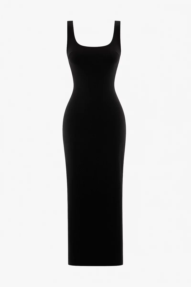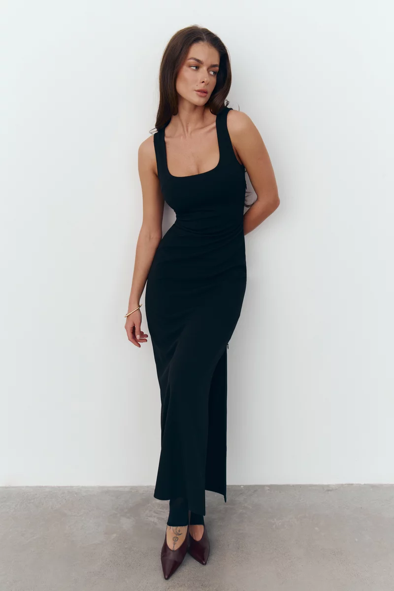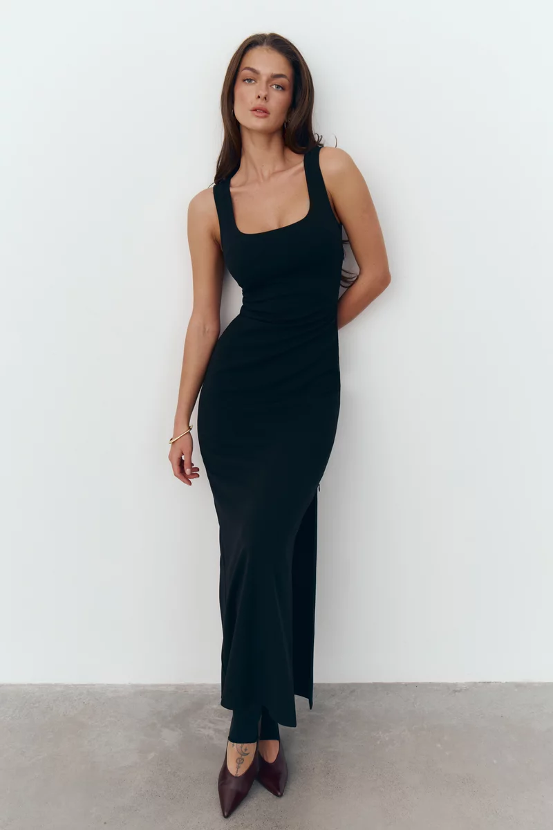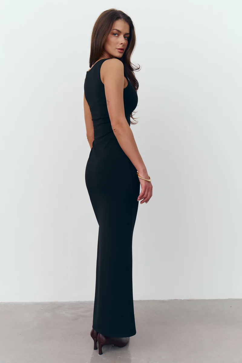 Черное трикотажное платье макси на широких бретелях