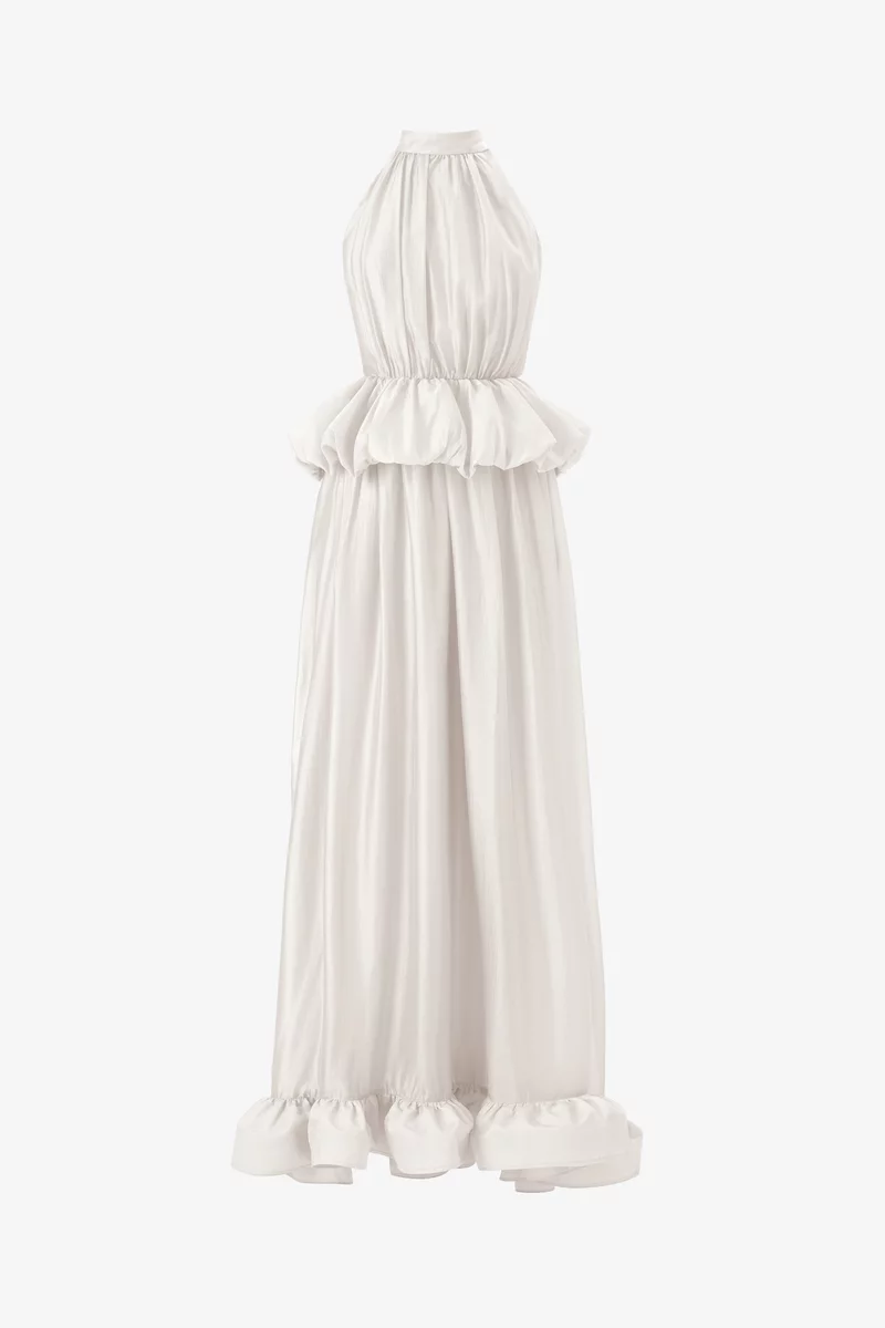 Платье макси из органзы, напоминающее глоток свежего воздуха и придающее образу архитектурного объема, оставаясь при этом абсолютно невесомым и прозрачным. Модель стилизована воротником-стойкой, подчеркнутой талией и юбкой-клеш с рюшами. Застёгивается на скрытую молнию сзади. На подкладке