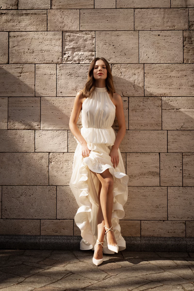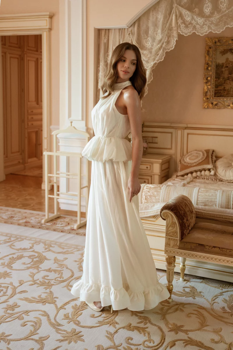 Молочное платье макси из органзы с рюшами