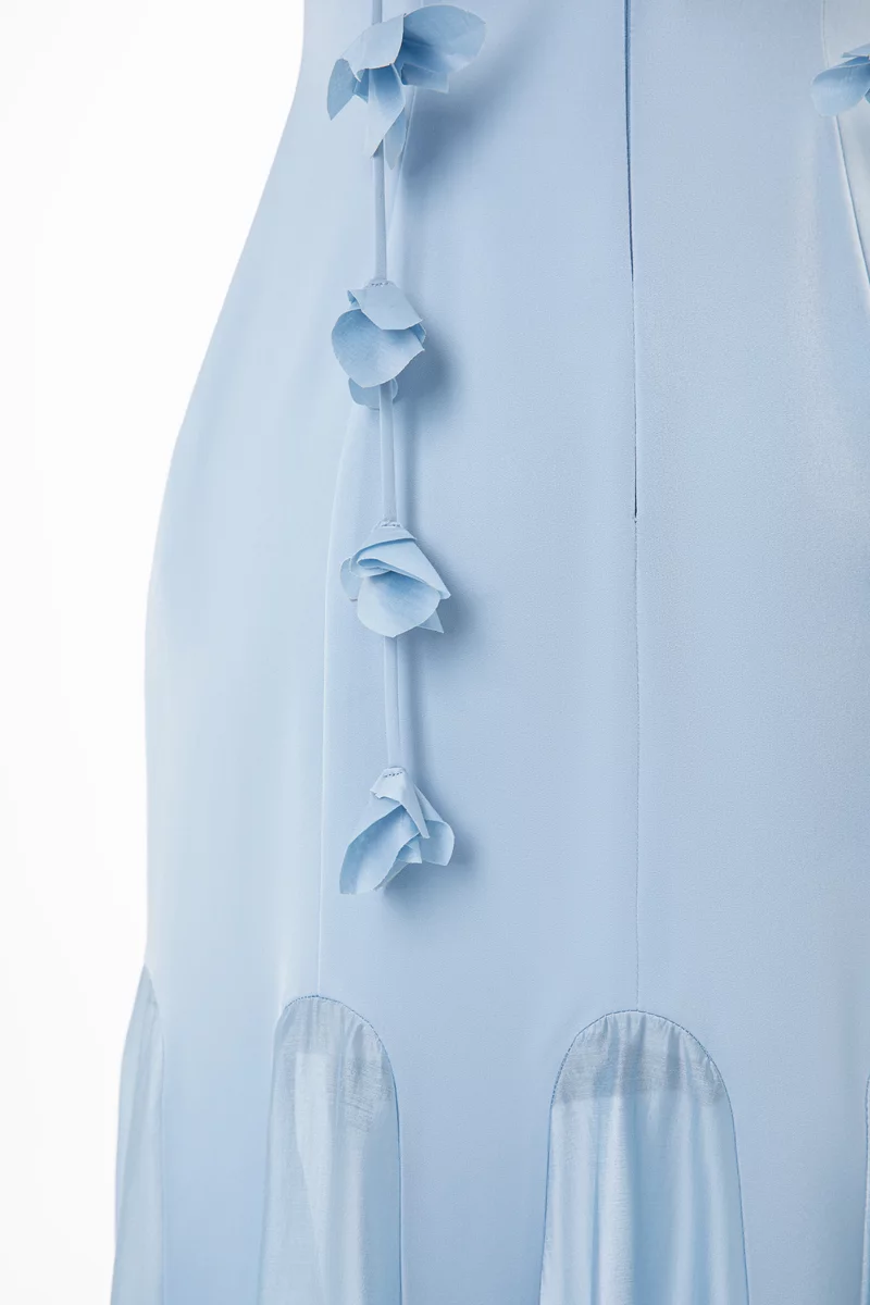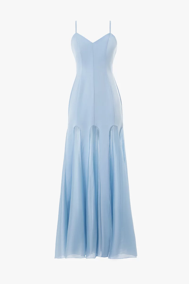 Платье макси из приятного к телу сатина с гладкой фактурой. Подчеркнутая талия и расклешенный крой юбки с акцентными вставками из органзы моделируют изящный силуэт. Модель на тонких регулируемых бретелях на завязку. Застёгивается на скрытую молнию сзади