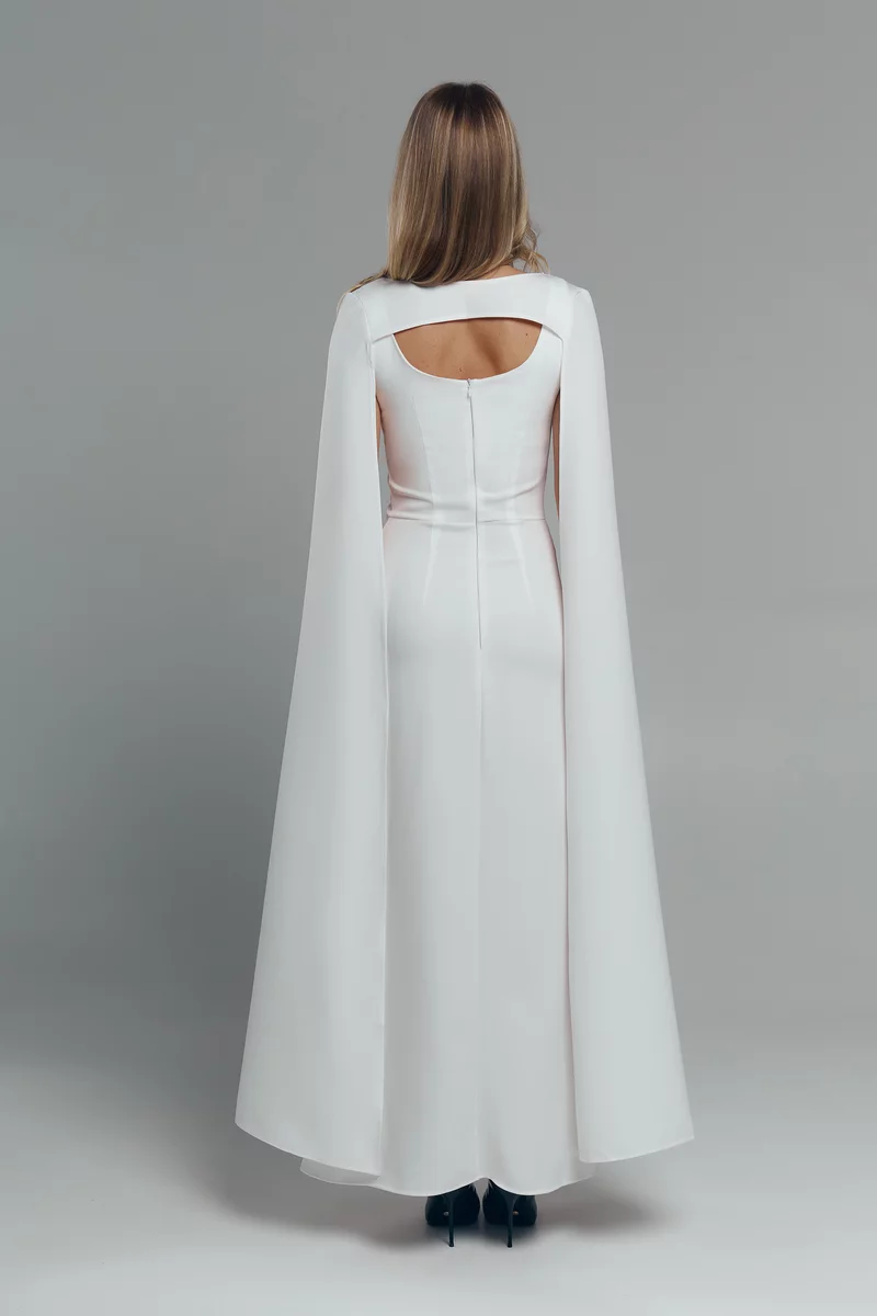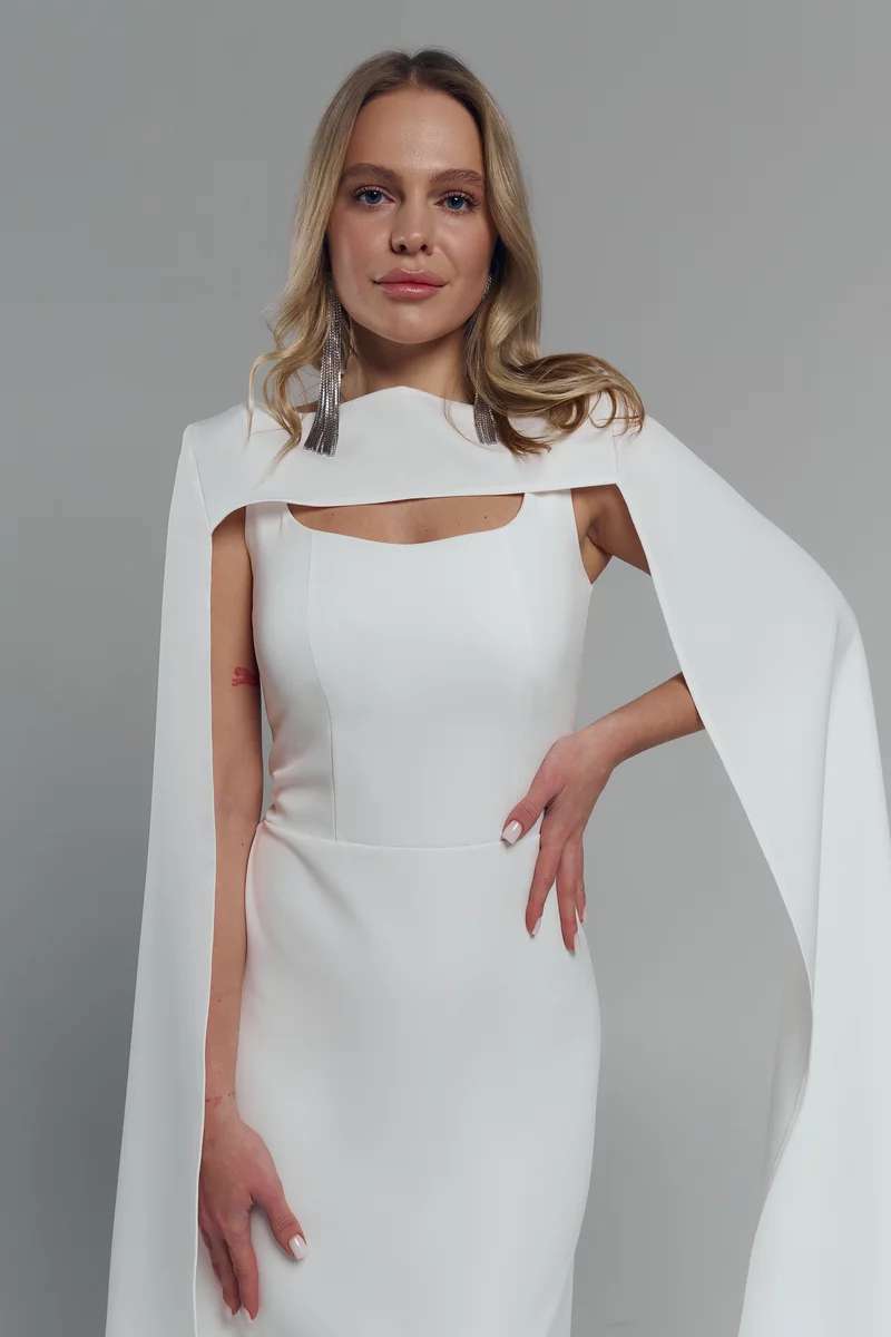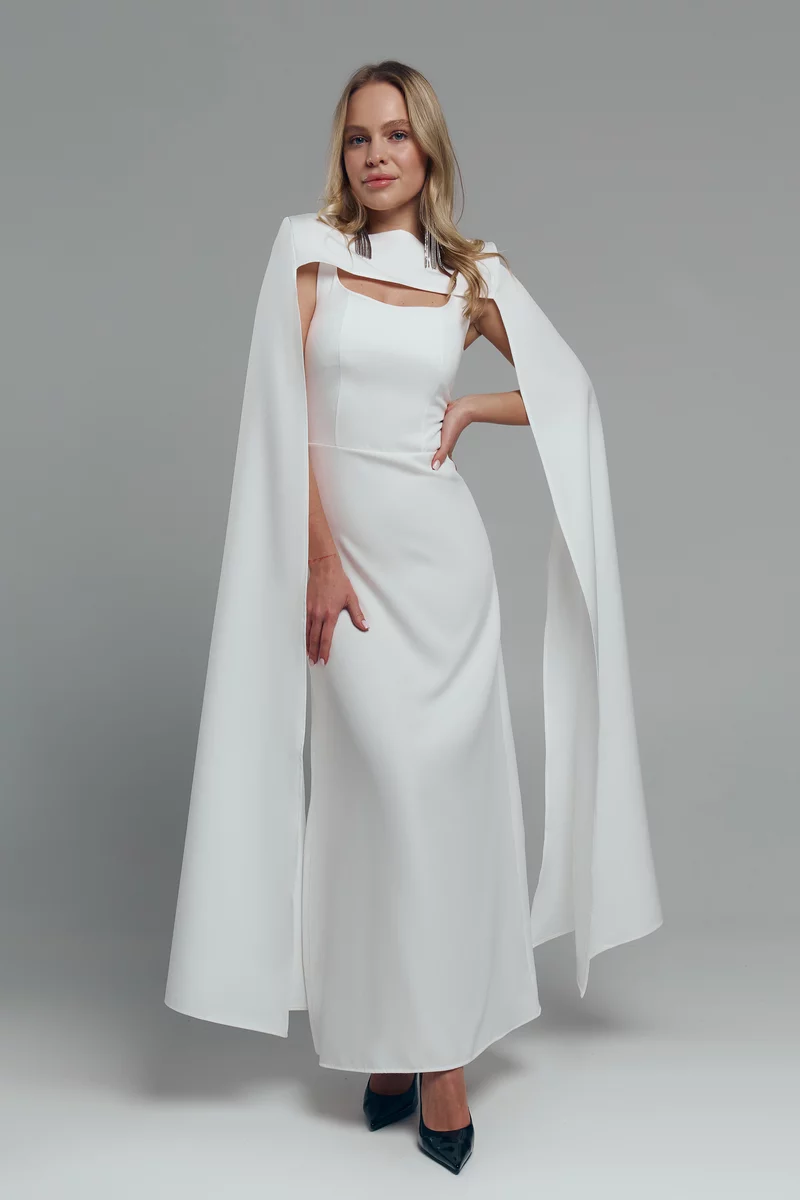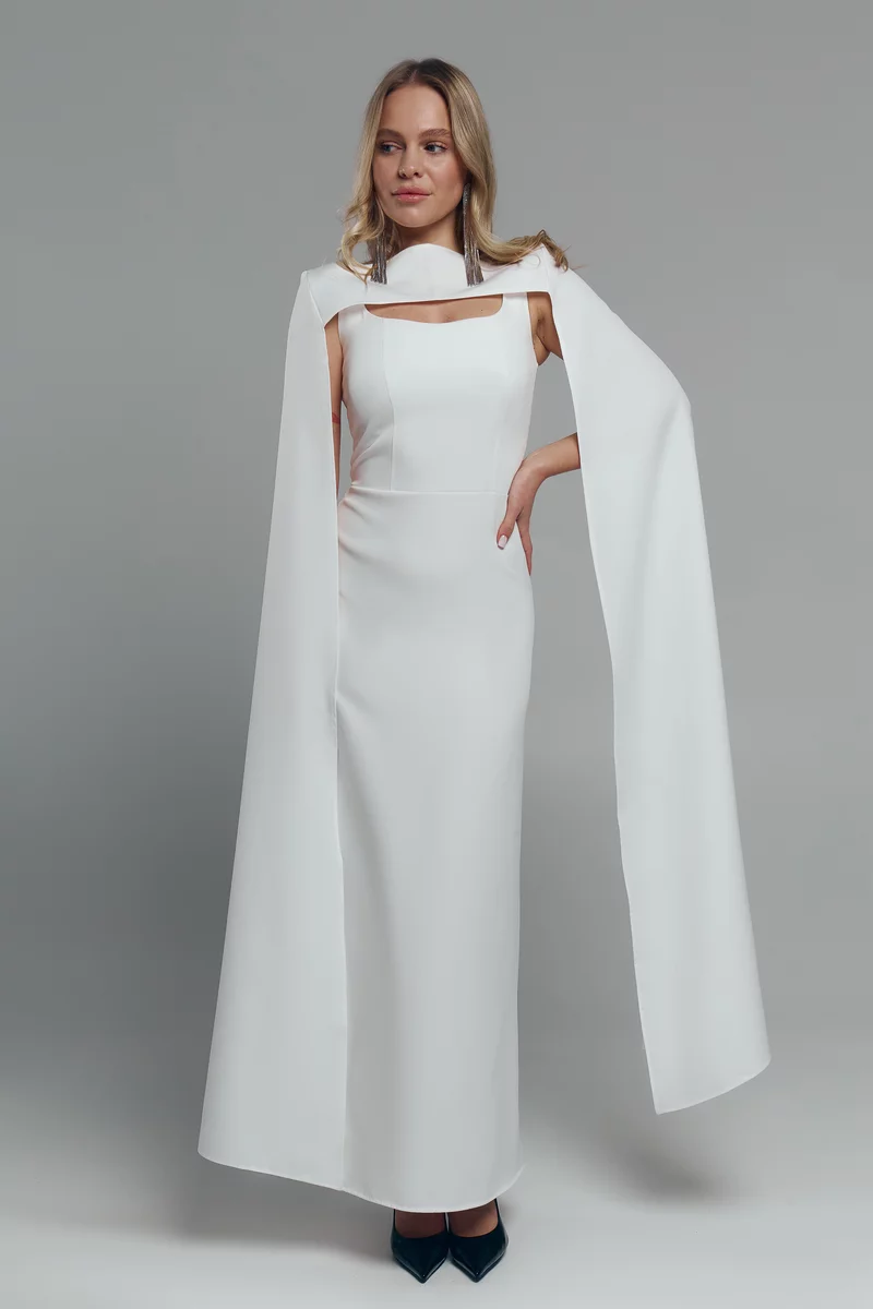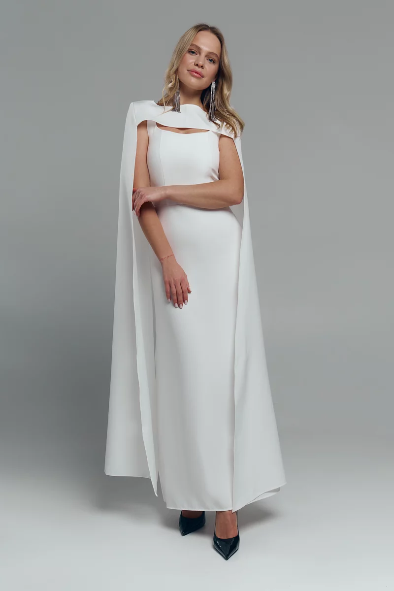 Платье макси из костюмной ткани с акцентной накидкой. Платье на широких бретелях, с подчеркнутой талией и слегка расклешенной юбкой. Застёгивается на скрытую молнию сзади. Платье эффектно смотрится как в комплекте, так и как отдельный элемент, что позволяет создать несколько вариантов вечерних образов