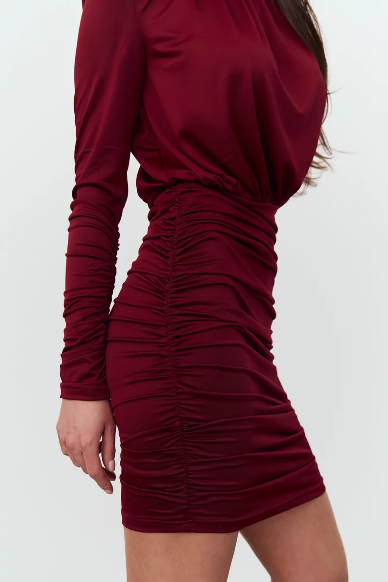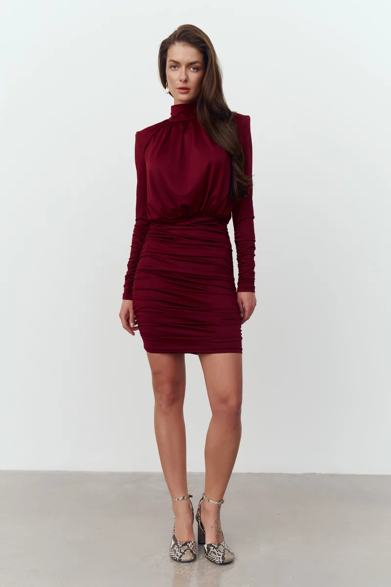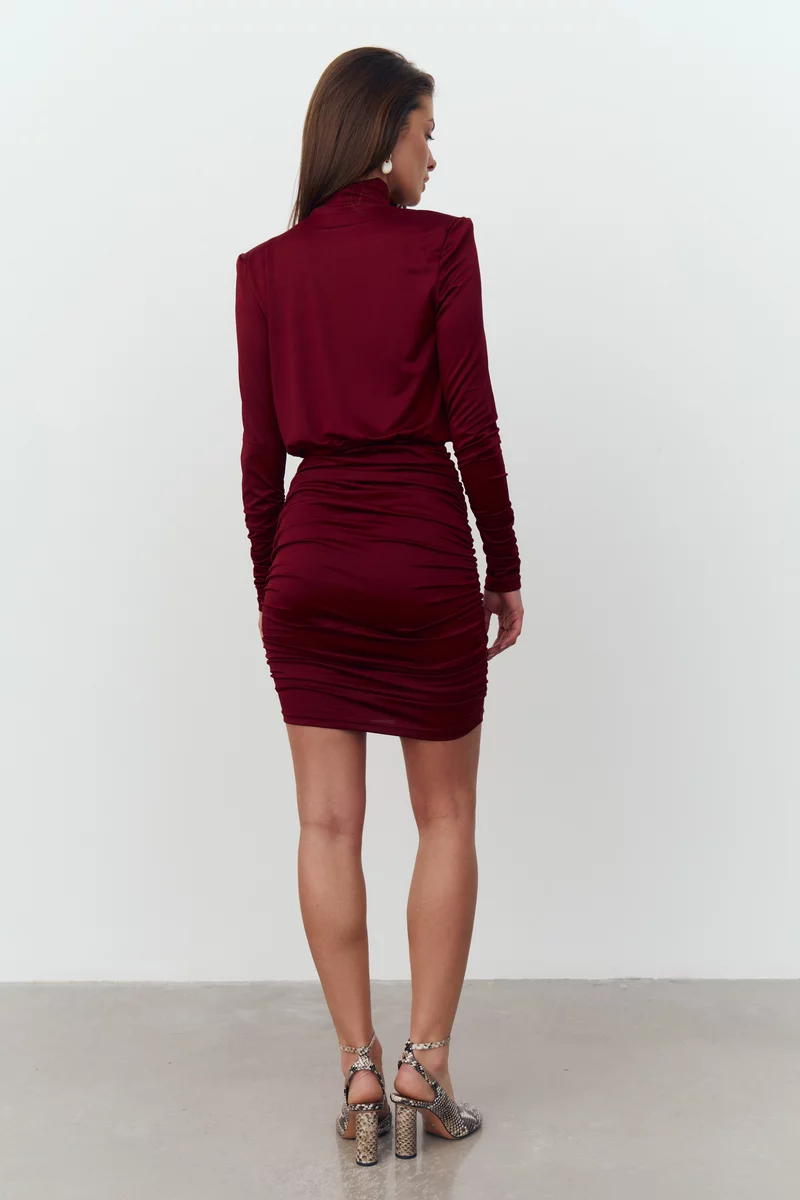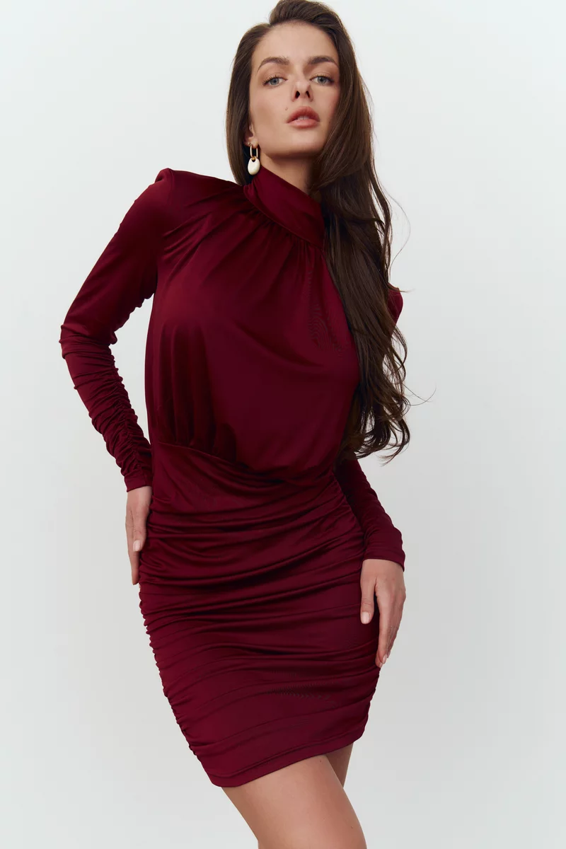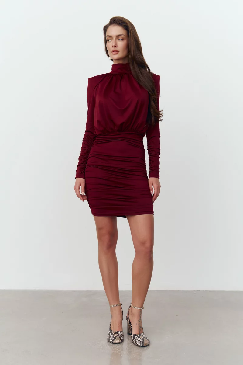 Платье мини приталенного кроя из эластичного трикотажа. Модель стилизована драпировкой по бокам и на рукавах. В плечах предусмотрены мягкие вставки
