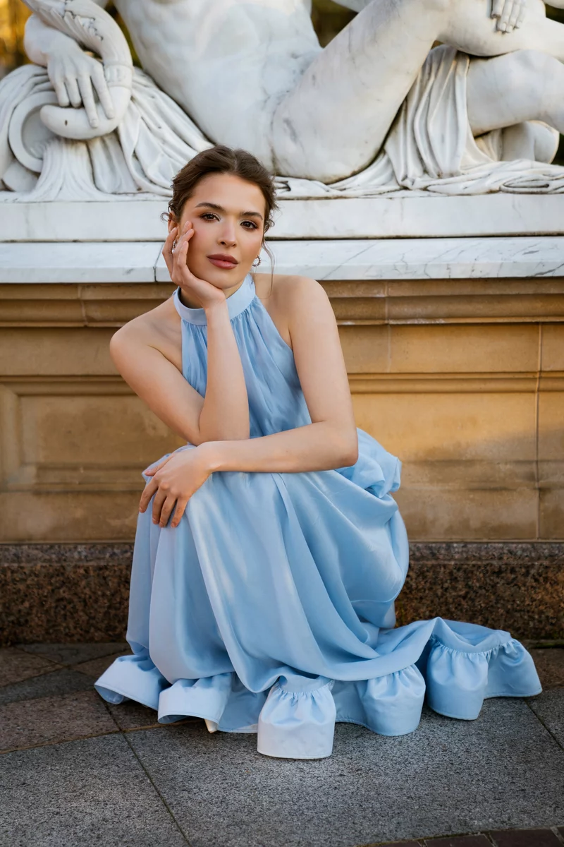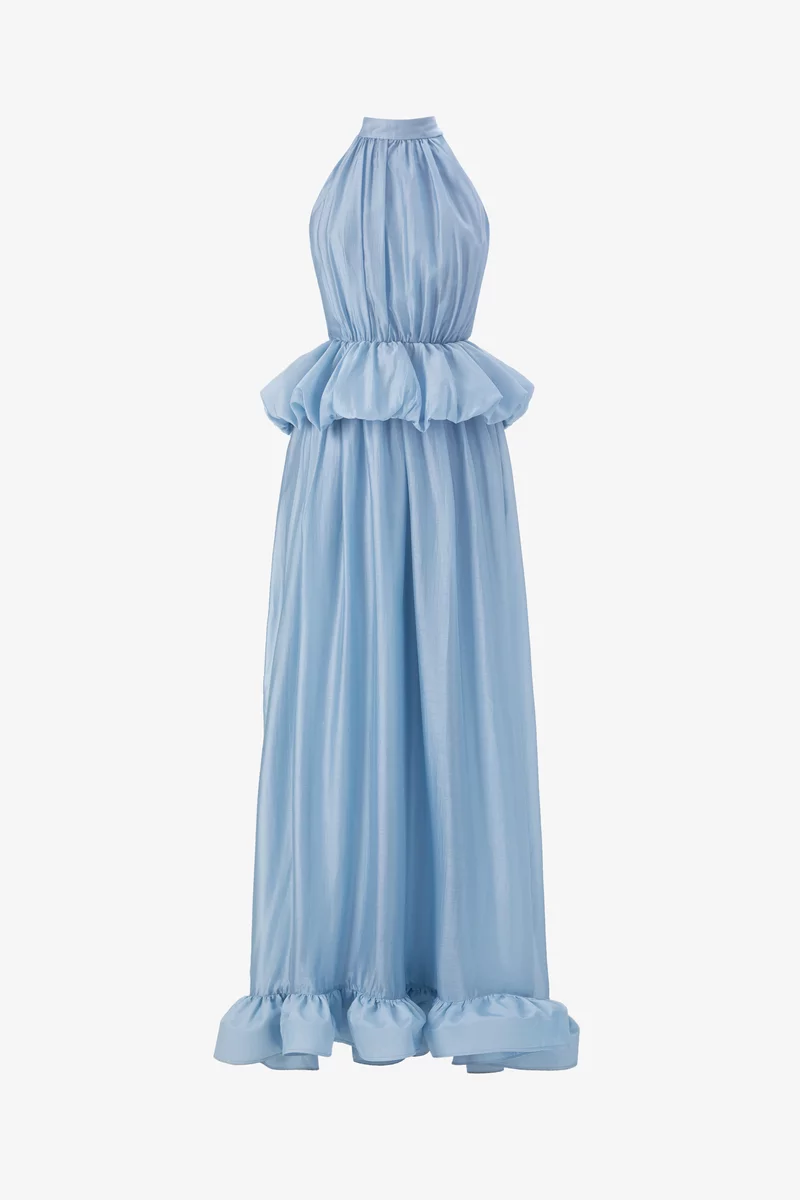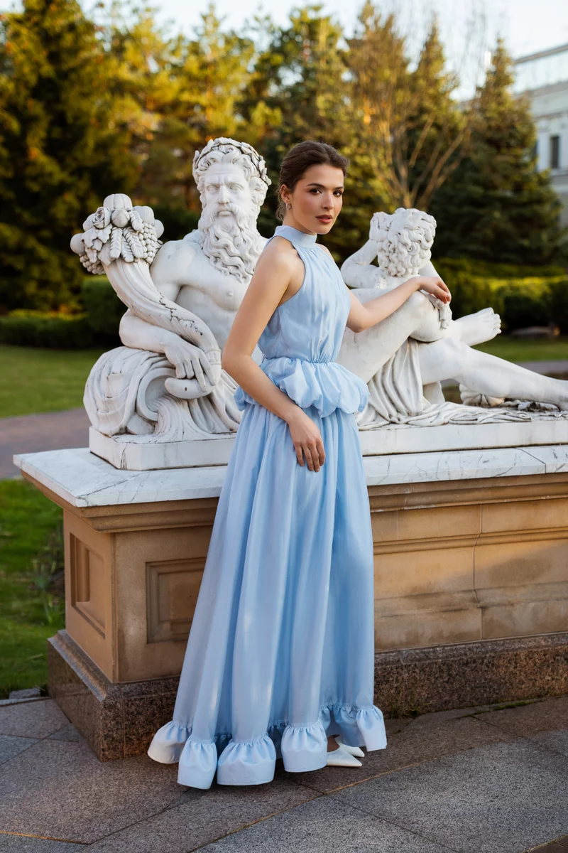 Платье макси из органзы, напоминающее глоток свежего воздуха и придающее образу архитектурного объема, оставаясь при этом абсолютно невесомым и прозрачным. Модель стилизована воротником-стойкой, подчеркнутой талией и юбкой-клеш с рюшами. Застёгивается на скрытую молнию сзади. На подкладке