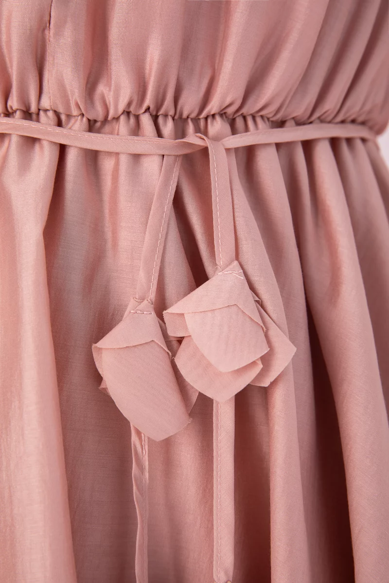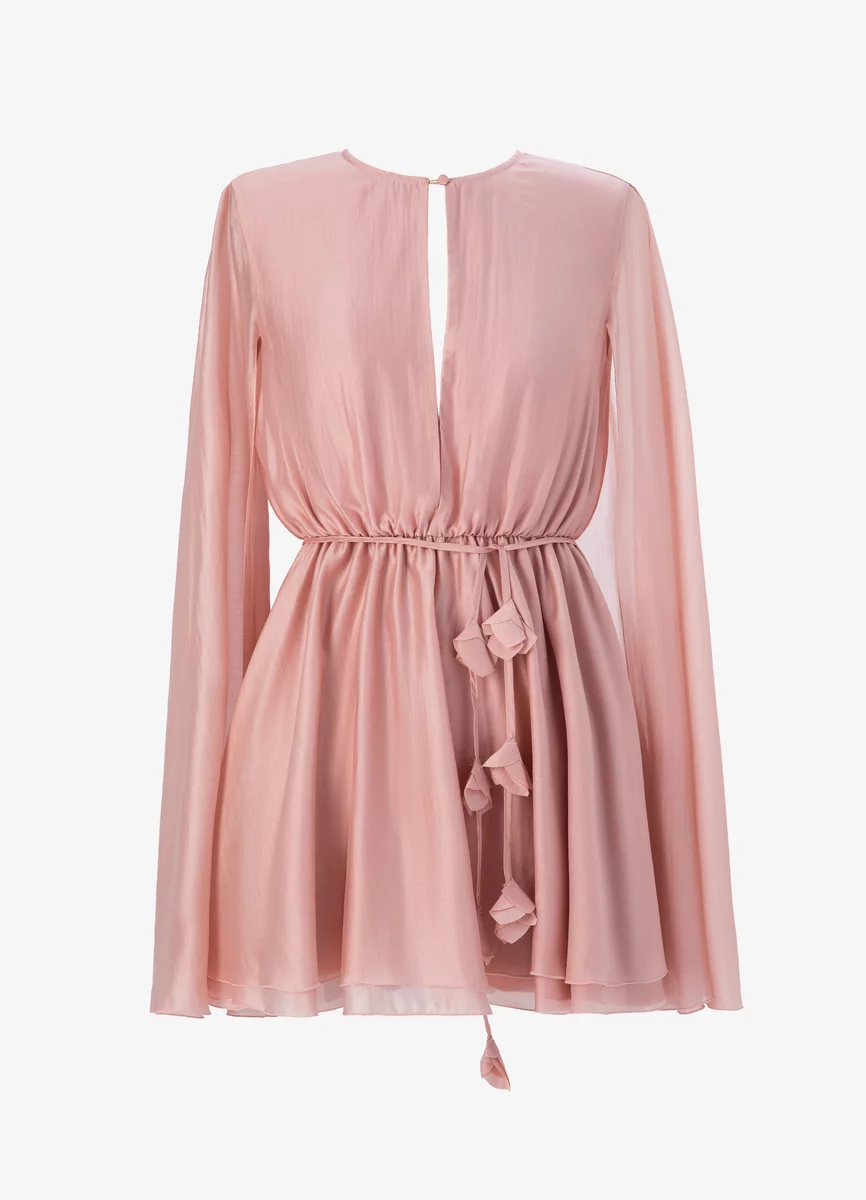 Платье-кейп мини из органзы, напоминающей глоток свежего воздуха и придающей образу архитектурного объема, оставаясь при этом абсолютно невесомым и прозрачным. Модель стилизована подчеркнутой талией и многослойной юбкой-клеш. Съемный пояс с цветами в комплекте. Застёгивается на пуговицу спереди