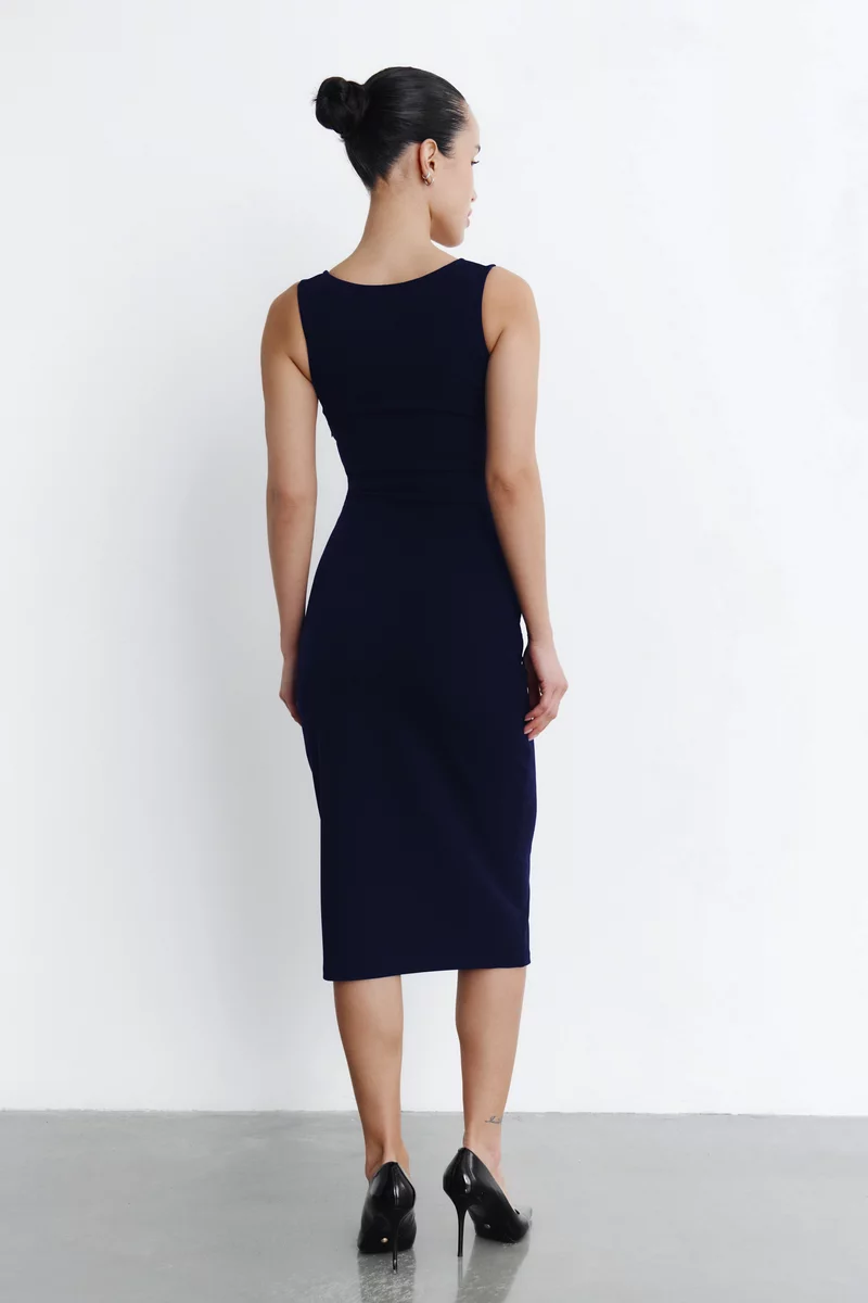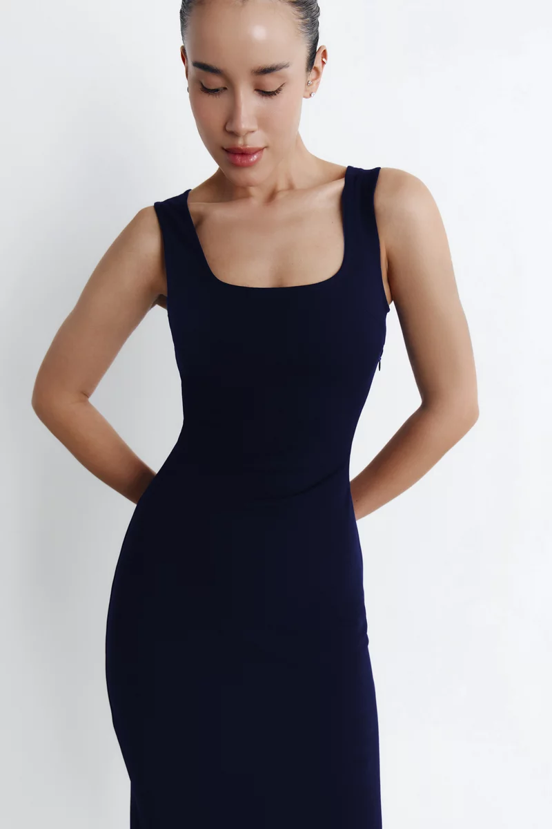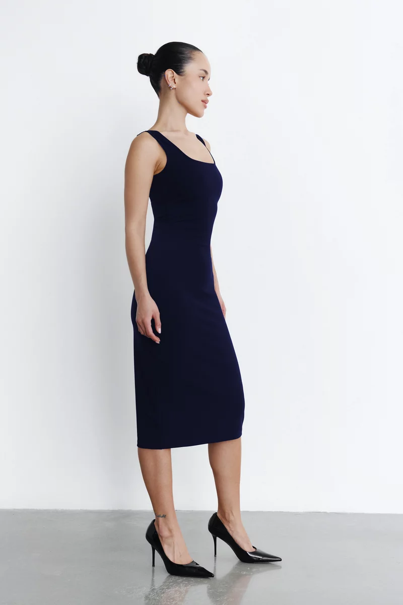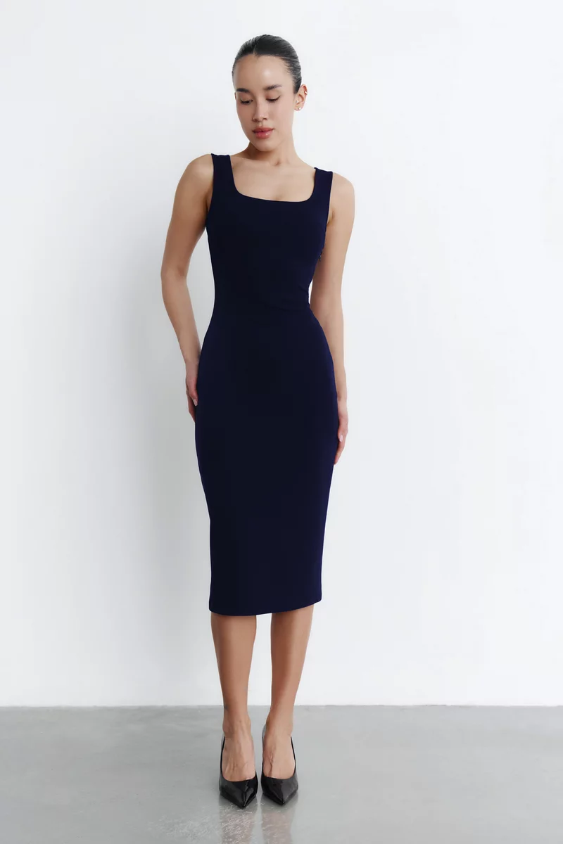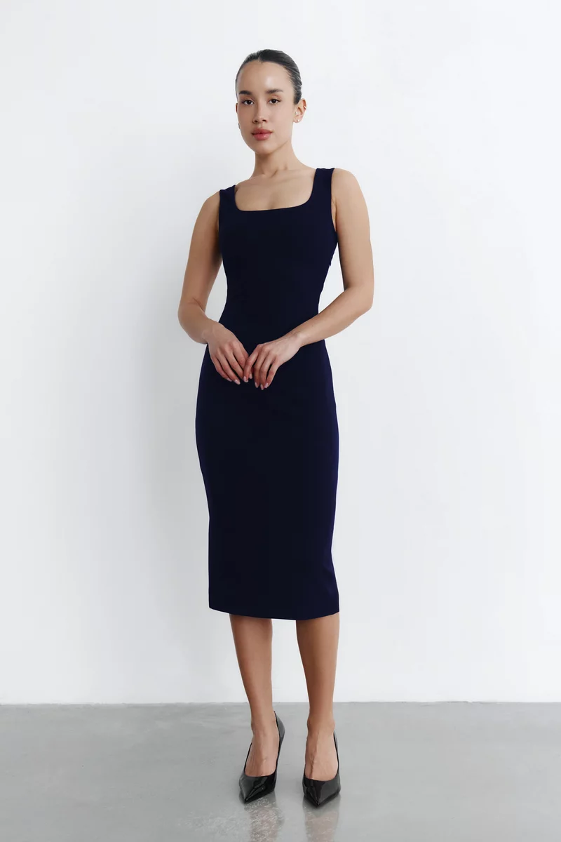 Синее трикотажное платье миди на широких бретелях