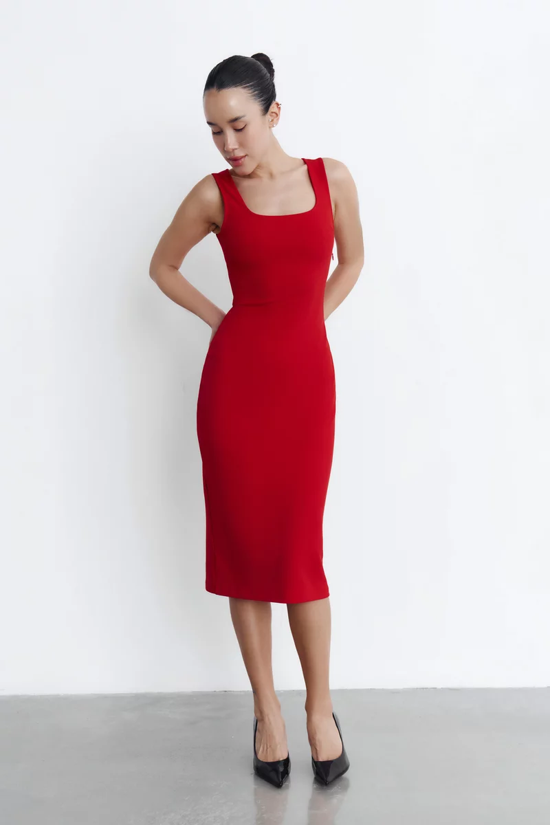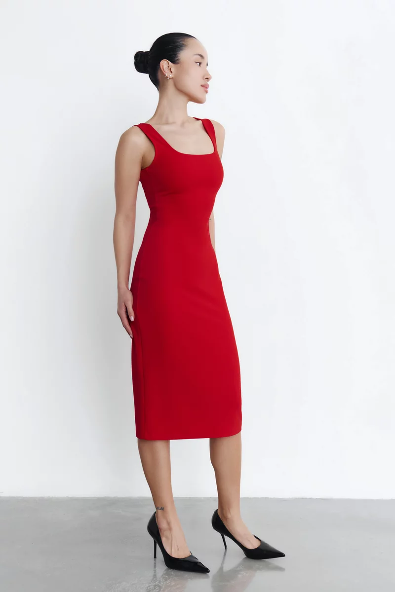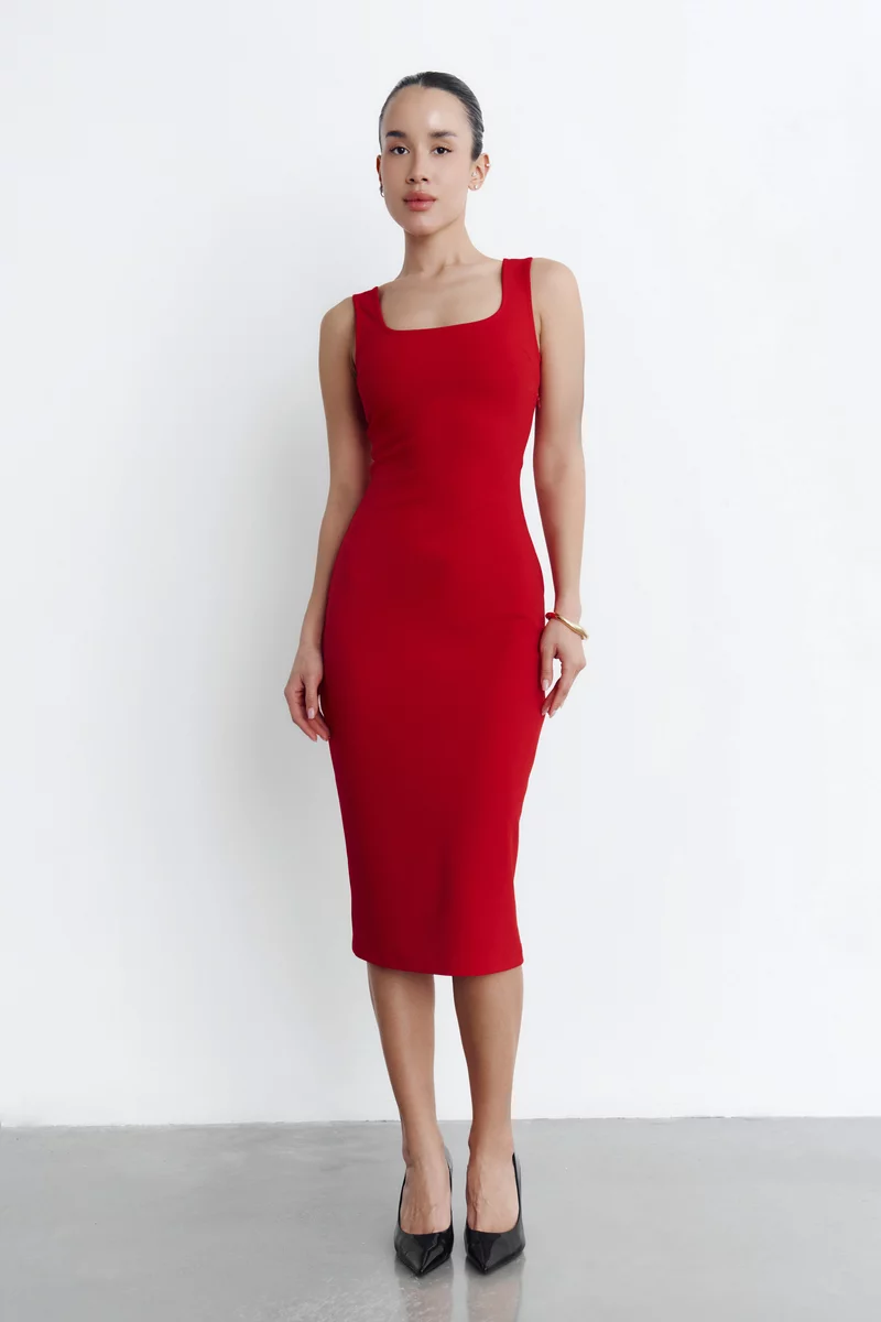 Платье миди из эластичного креп-дайвинга. Модель с подчеркнутой талией. Застёгивается на скрытую молнию сбоку