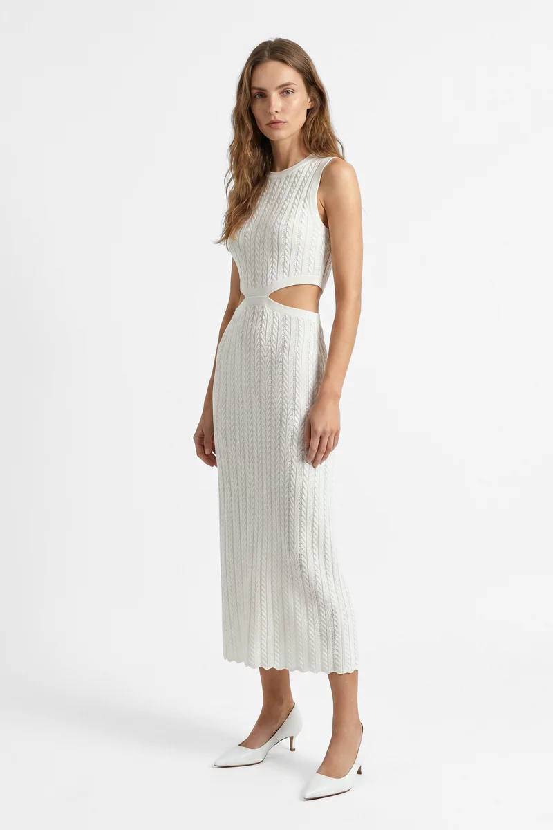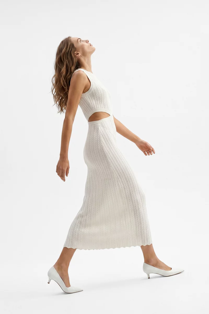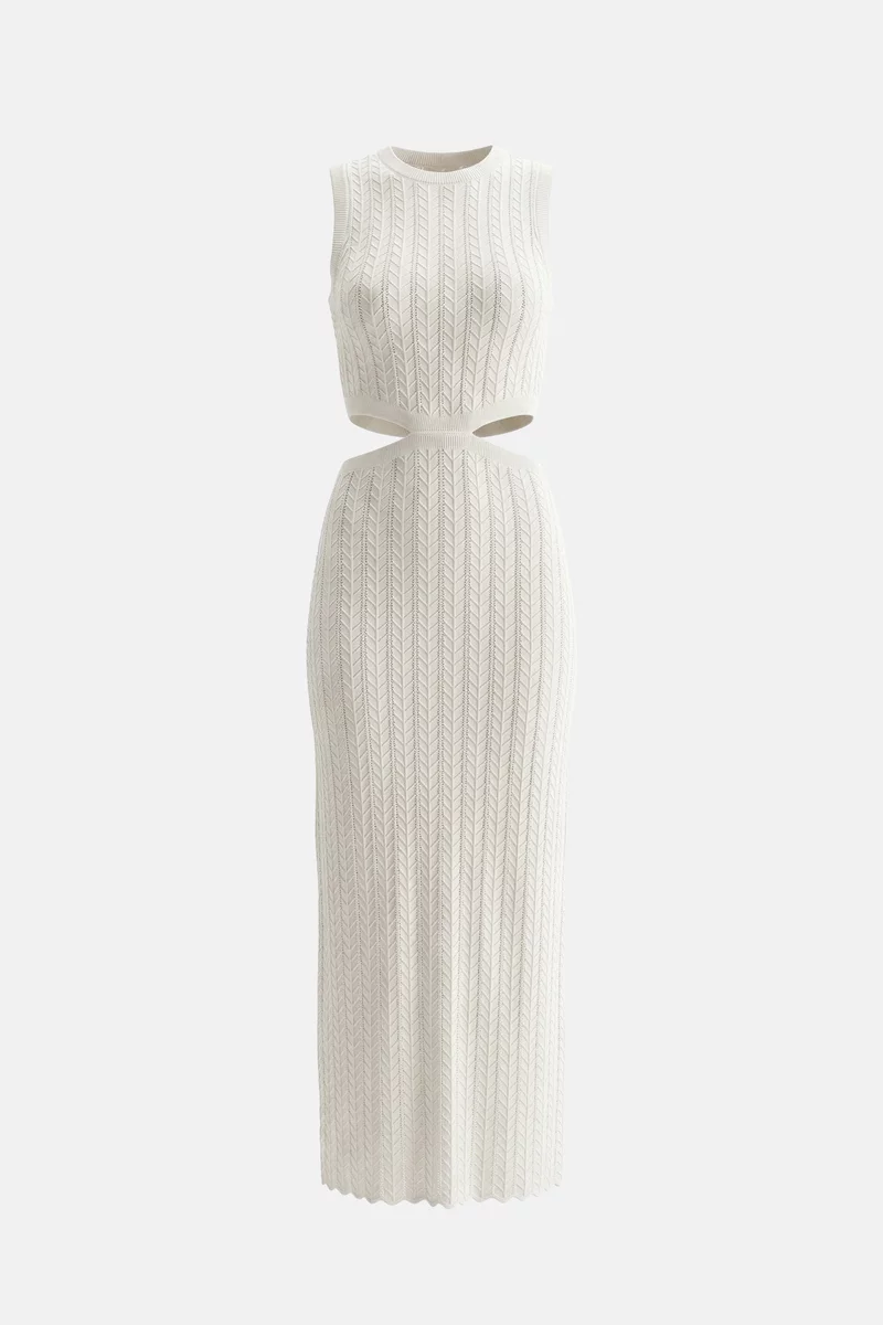 Молочное трикотажное платье макси с акцентными вырезами