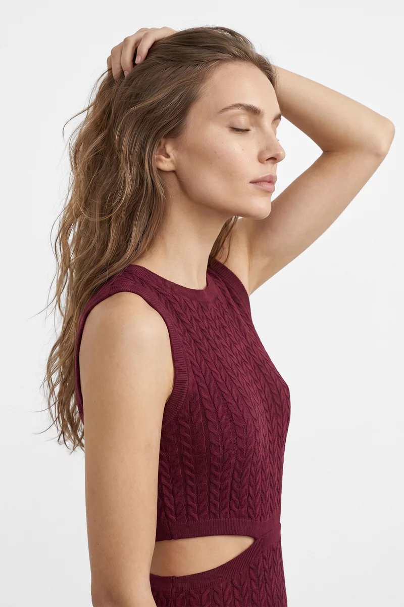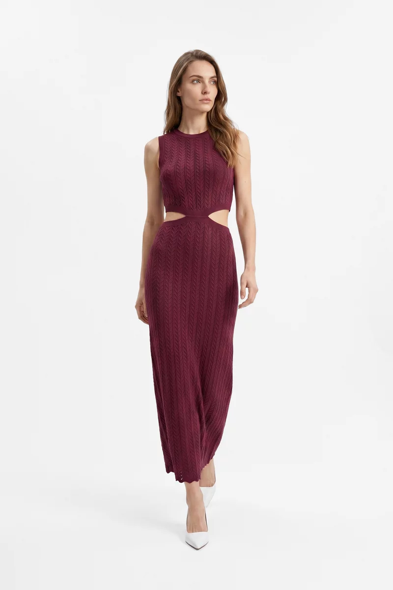 Платье макси из мягкого и приятного на ощупь трикотажа с ажурной вязкой. Эффектно моделирует силуэт. Платье стилизованное акцентными боковыми вырезами на талии