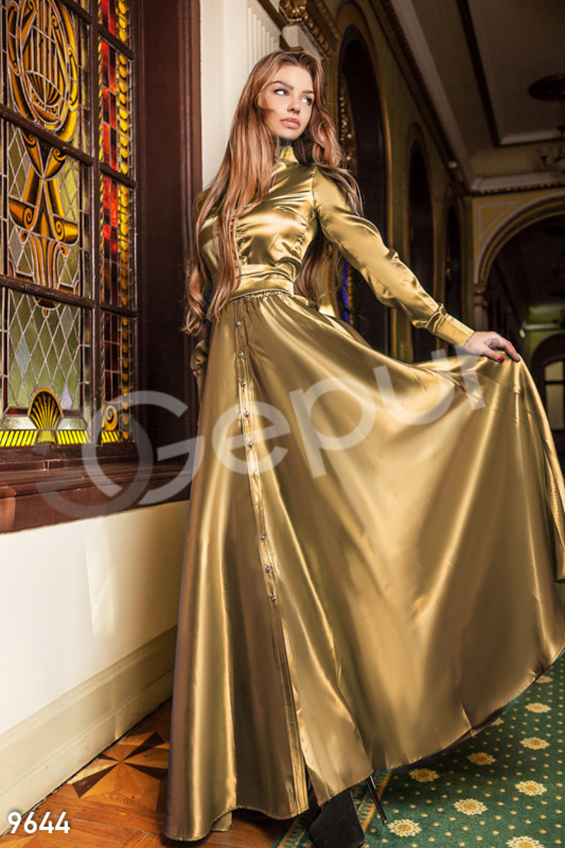 Платье в пол, с длинным рукавом, воротником-стойкой, планка с золотыми пуговками на всю длину, манжет с пуговицей. Идет с широким поясом в тон платья.