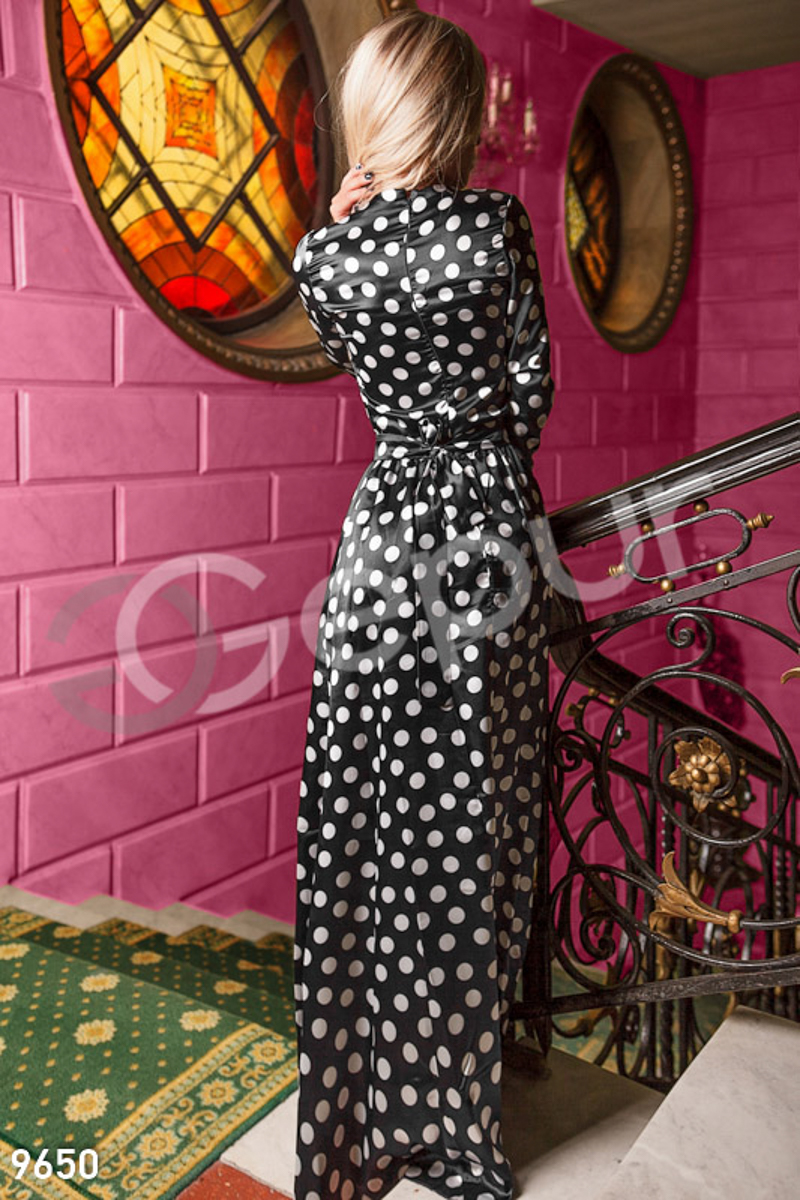 Элегантное платье, выполненное из струящегося атласа в горошек: высокий круглый вырез, длинный рукав без манжет, эластичная вставка на поясе, расклешенная юбка, дополненная широким съемным поясом в тон.