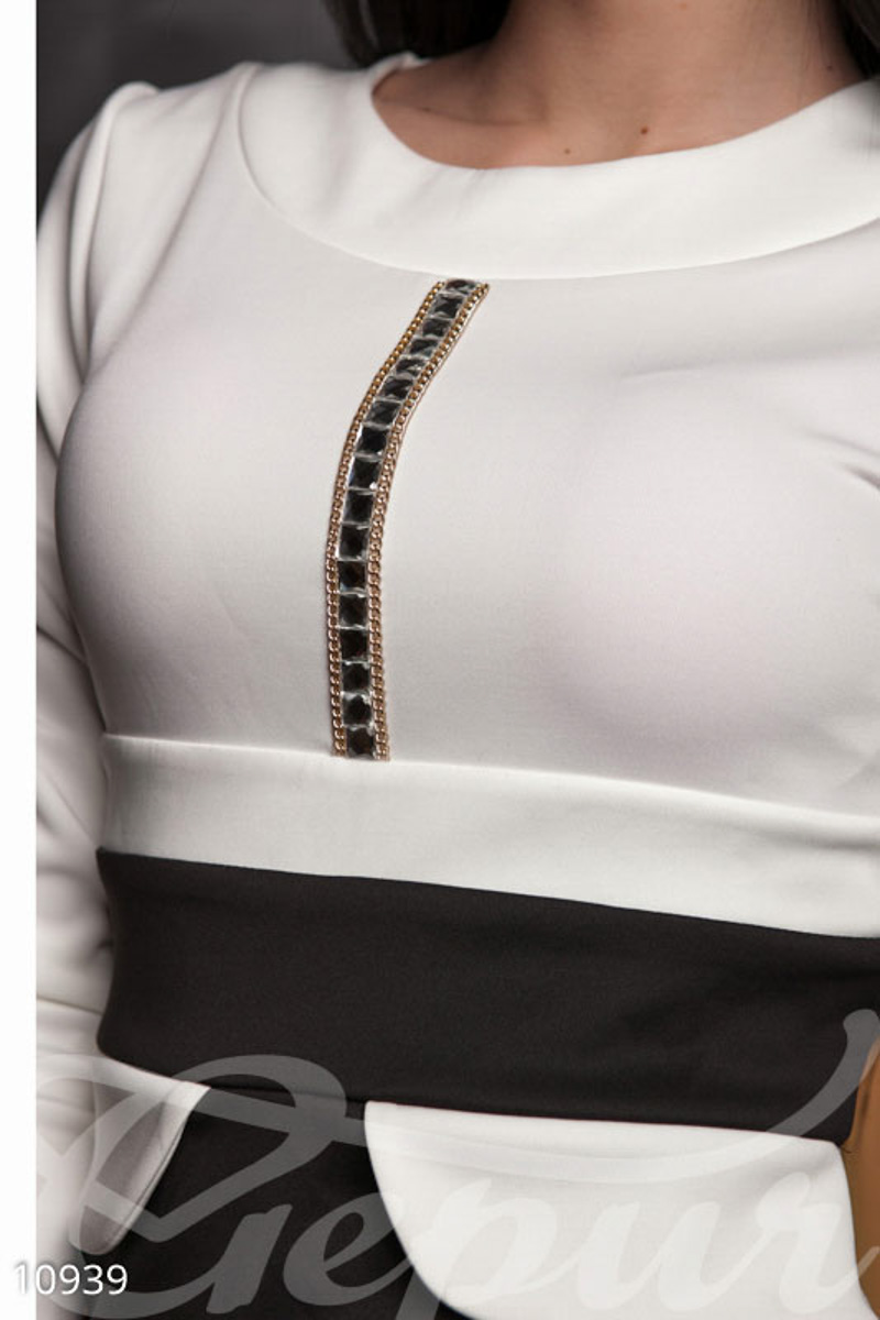 Элегантное платье, выполненное из плотной эластичной ткани: сдержанная кокетка с декоративными камнями, слегка завышенная линия талии, длинный рукав без манжет, втачной пояс с импровизированной баской и облегающая юбка-миди, дополненная сзади высоким разрезом.