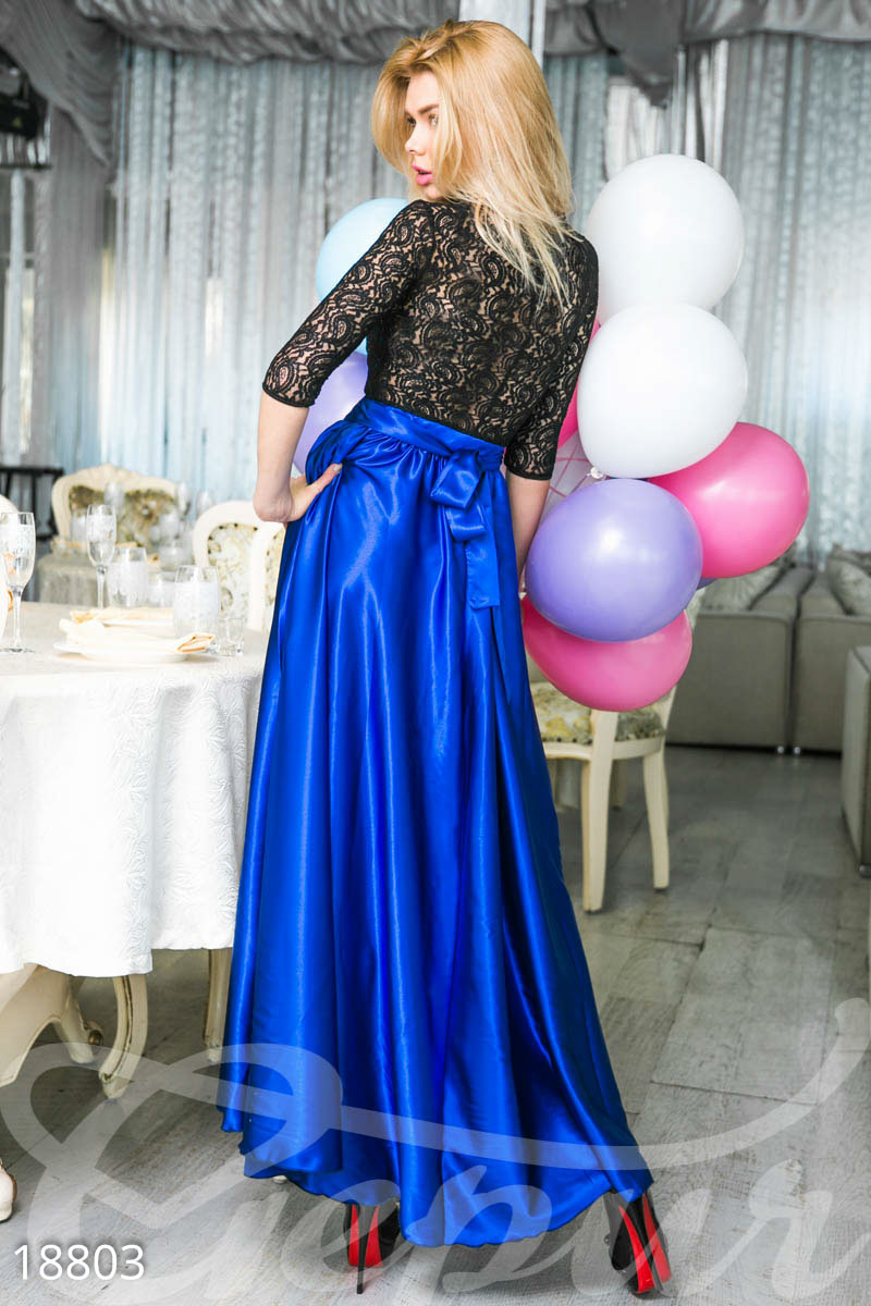 Платье в пол для незабываемого вечернего выхода. Верх выполнен из стрейчевого гипюра на атласном подкладе. А струящаяся свободная юбка,присборенная на резинке - из атласа с глянцевым отливом. В комплекте идет атласный пояс, для создания дополнительного акцента на талии.