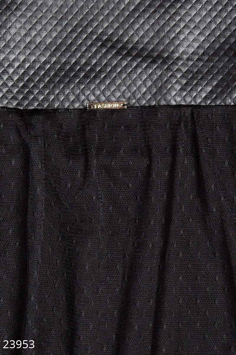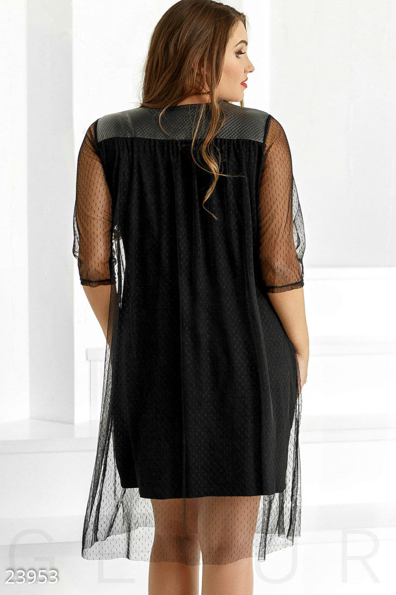 Оригинальное платье прямого кроя с кокеткой из эко-кожи, прозрачным рукавом 3/4 и дополнительной накидкой из сетки с фигурным плетением.