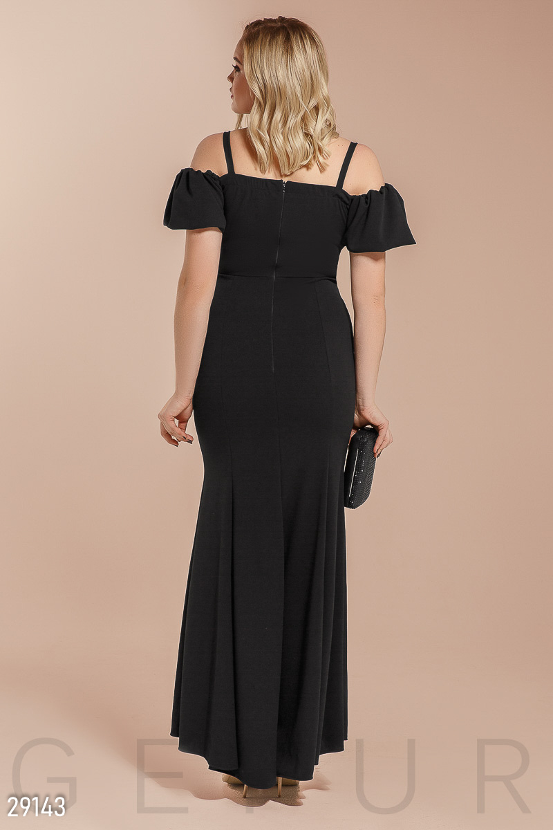 Платье-годе на тонких бретелях, с открытыми плечами, рукавом-фонарик, аккуратным вырезом-сердечко и слегка удлиненным подолом.