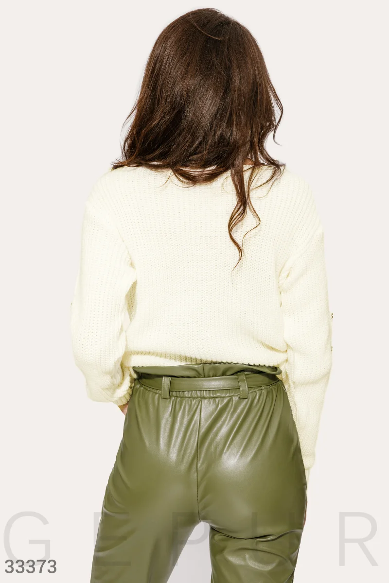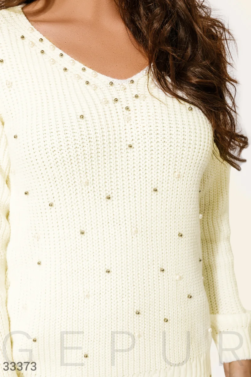 Вязаный пуловер свободного кроя и молочного цвета с круглым вырезом, длинным рукавом, дополненный жемчужным декором. Обращаем внимание, что бусины идут с заклепками.