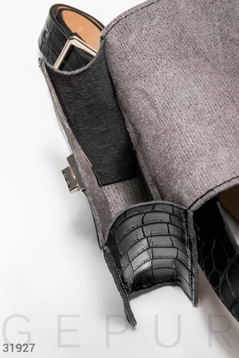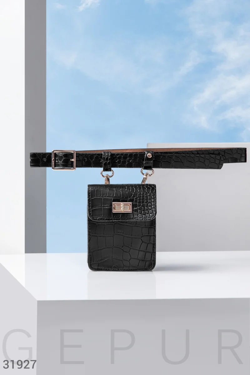 Поясная сумка-ремень черного цвета с фурнитурой золотистого оттенка: застежка-пряжка, регулируемая длина ремешка, маленькая вертикальная сумочка с тиснением под кожу крокодила. Размер съемной сумки: высота - 12 см, ширина - 10 см.