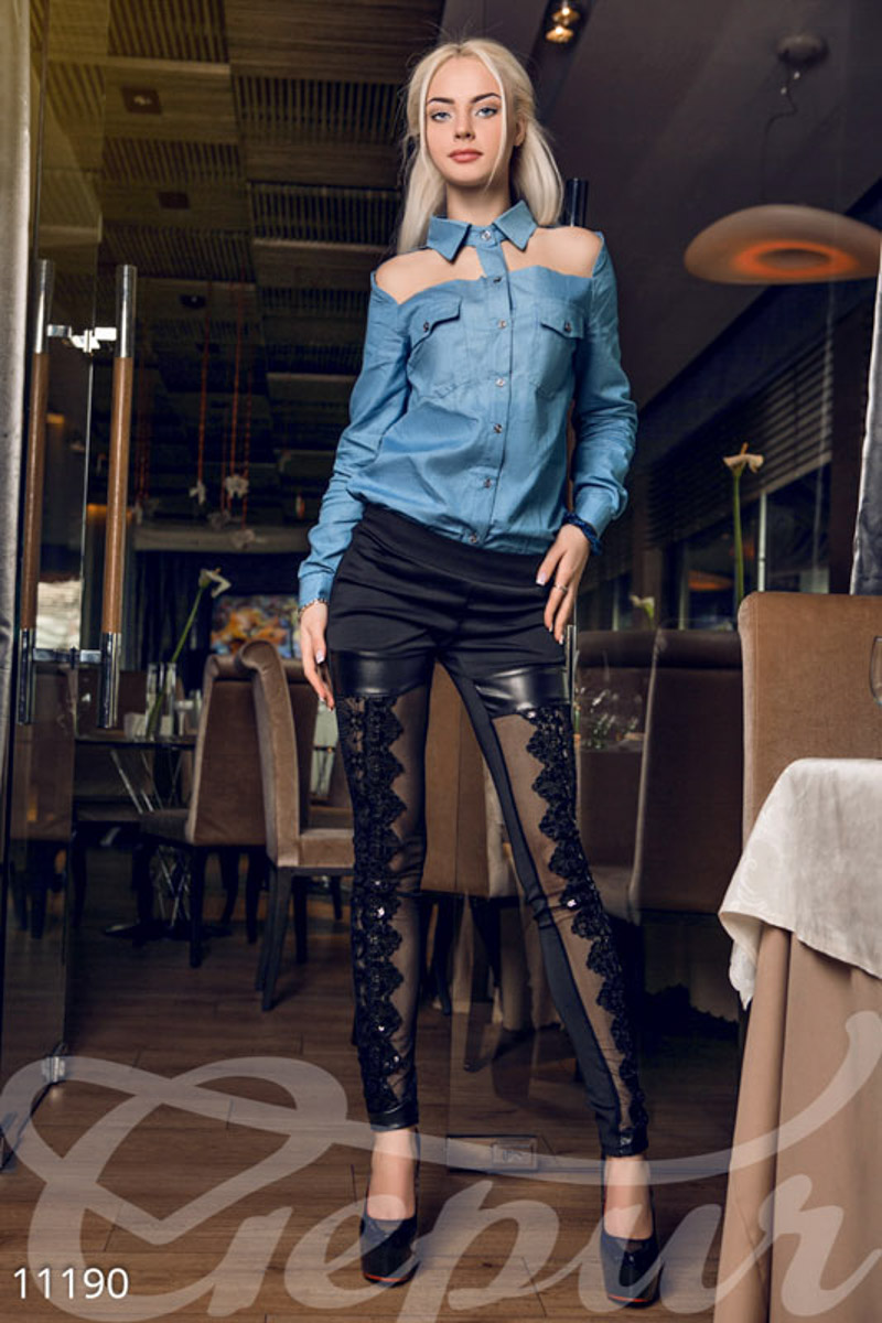Трендовая женская рубашка в стиле denim: строгий воротник со стойкой, длинный рукав с застежкой на пуговицу, два нагрудных кармана с клапаном и оригинальная кокетка с вырезами.