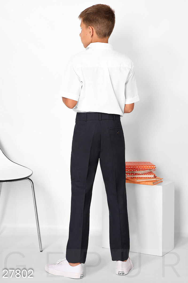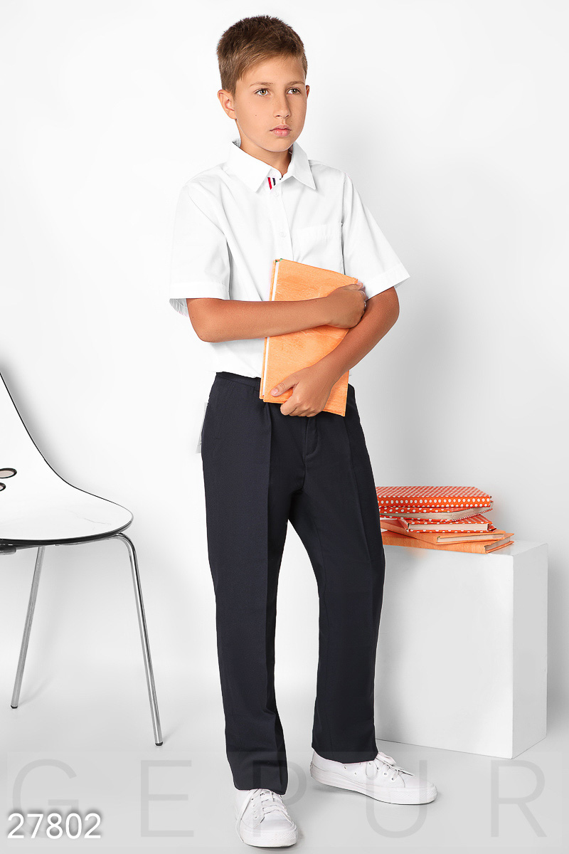 Классическая школьная рубашка с коротким рукавом, нагрудным карманом и цветной репсовой лентой на застежке.