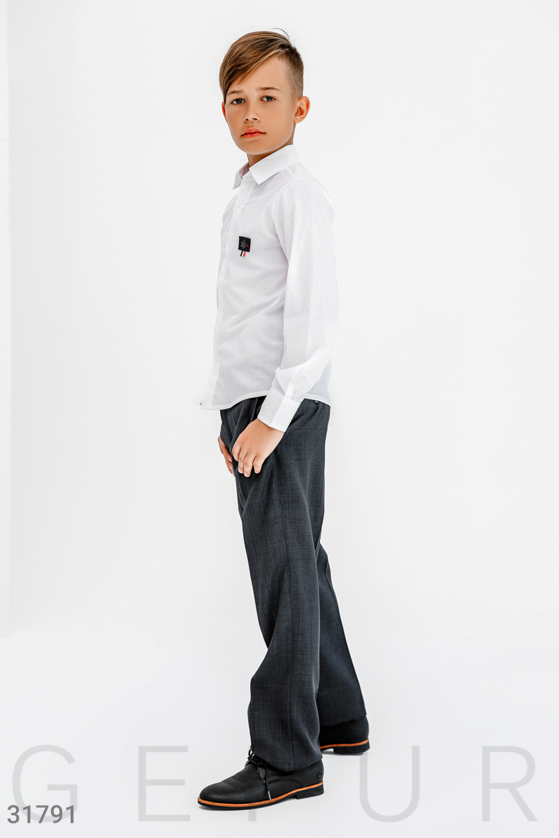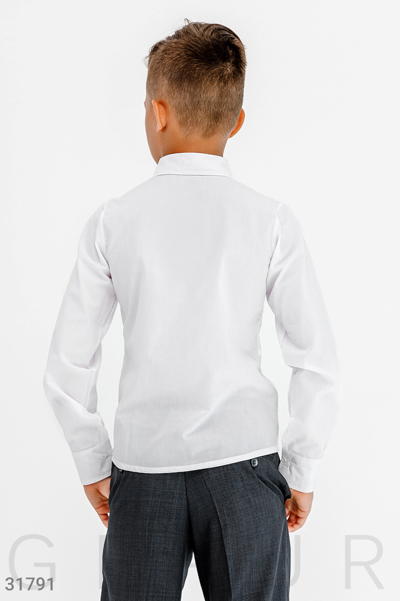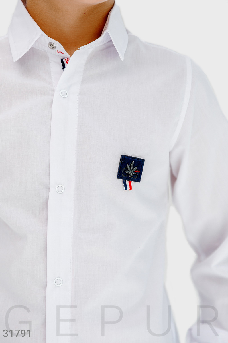 Классическая рубашка с отложным воротником, длинным рукавом, широкой манжетой и линией с кнопками спереди, дополненная нашивкой на груди.