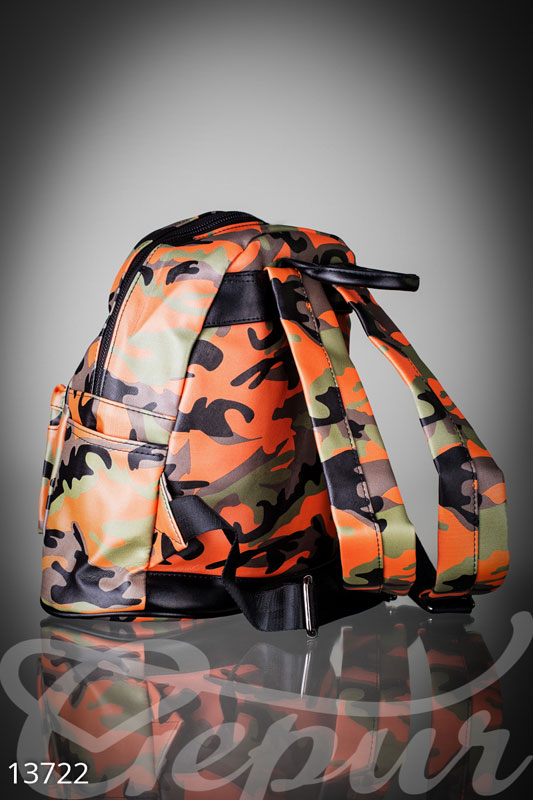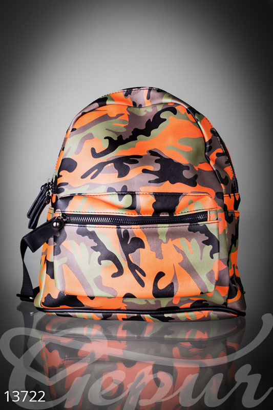 Яркий рюкзак расцветки милитари с регулируемыми лямками на плечи. Два отделения: небольшой карманчик на молнии с внешней стороны и большое отделение на молнии. Внутри большого отделения маленький карманчик на змейке и два карманчика для мобильного телефона. Рюкзак очень удобно брать на учебу, на прогулку или в поездку. Материал: экокожа Размеры: высота - 32 см, ширина - 35 см, глубина по донышку - 14.5 см, высота ручек - 9 см Цвет: цветной (хаки, оранжевый, черный)