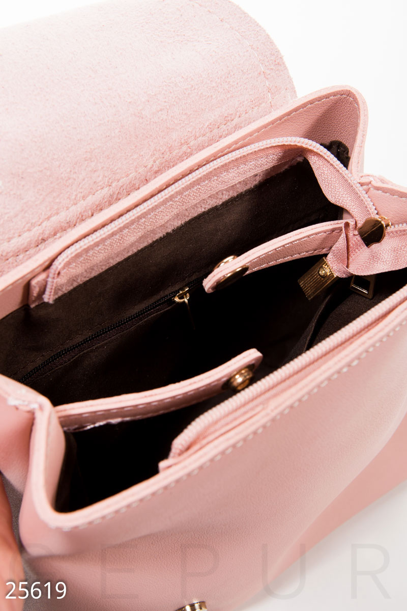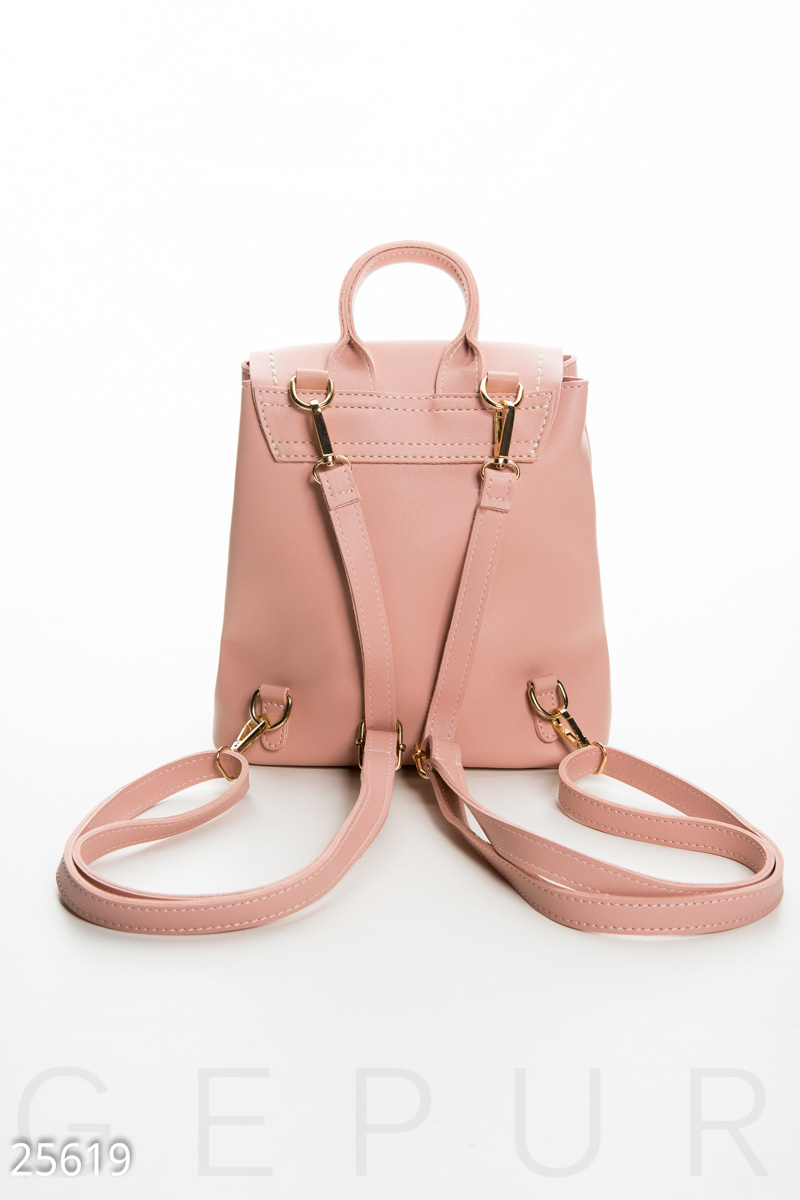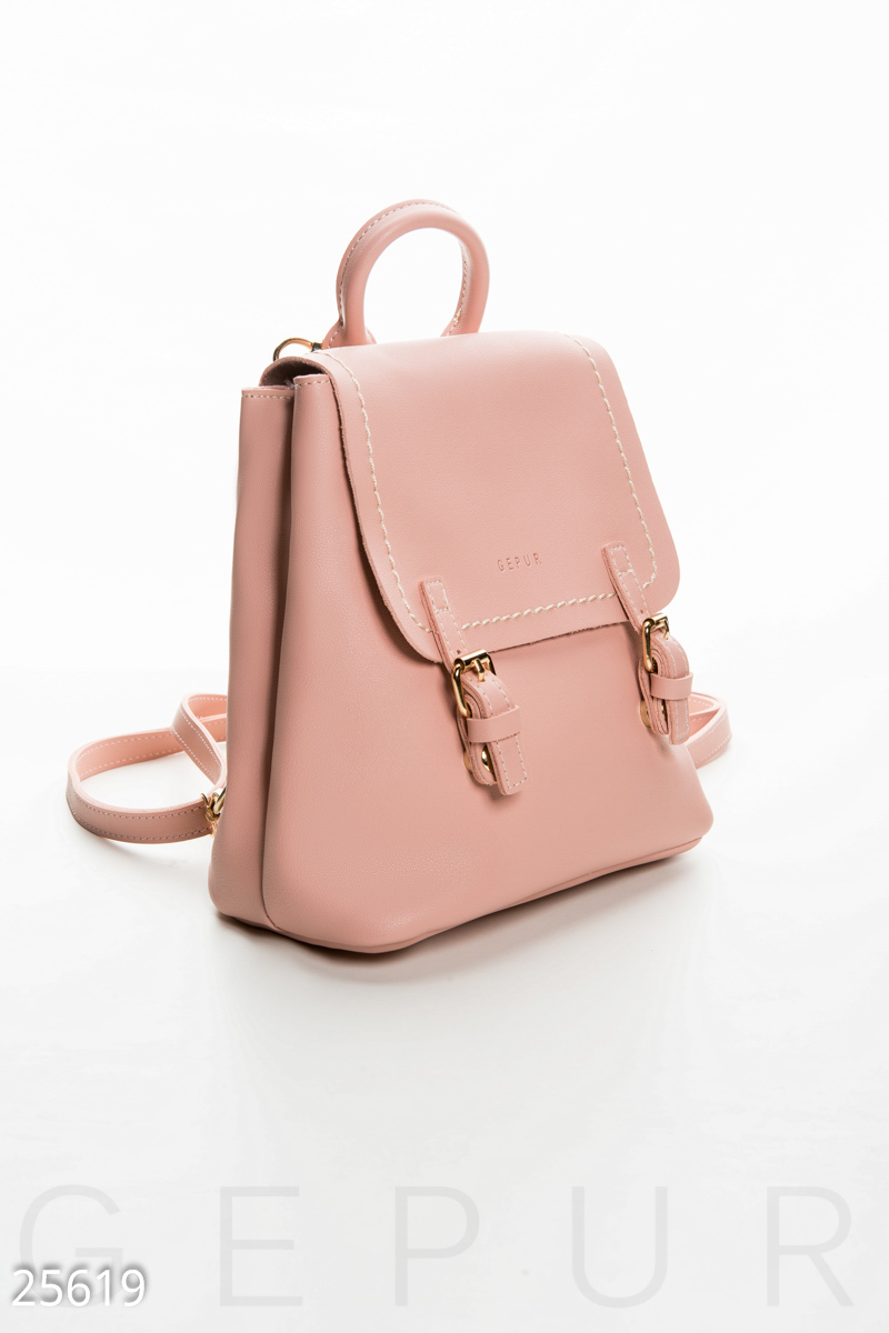 Небольшой практичный рюкзак из эко-кожи: клапан с декоративными пряжками и контрастной строчкой, съемные регулируемые лямки.