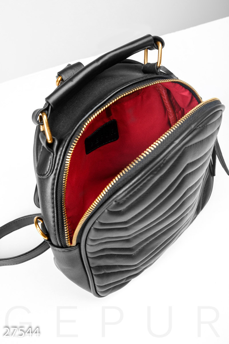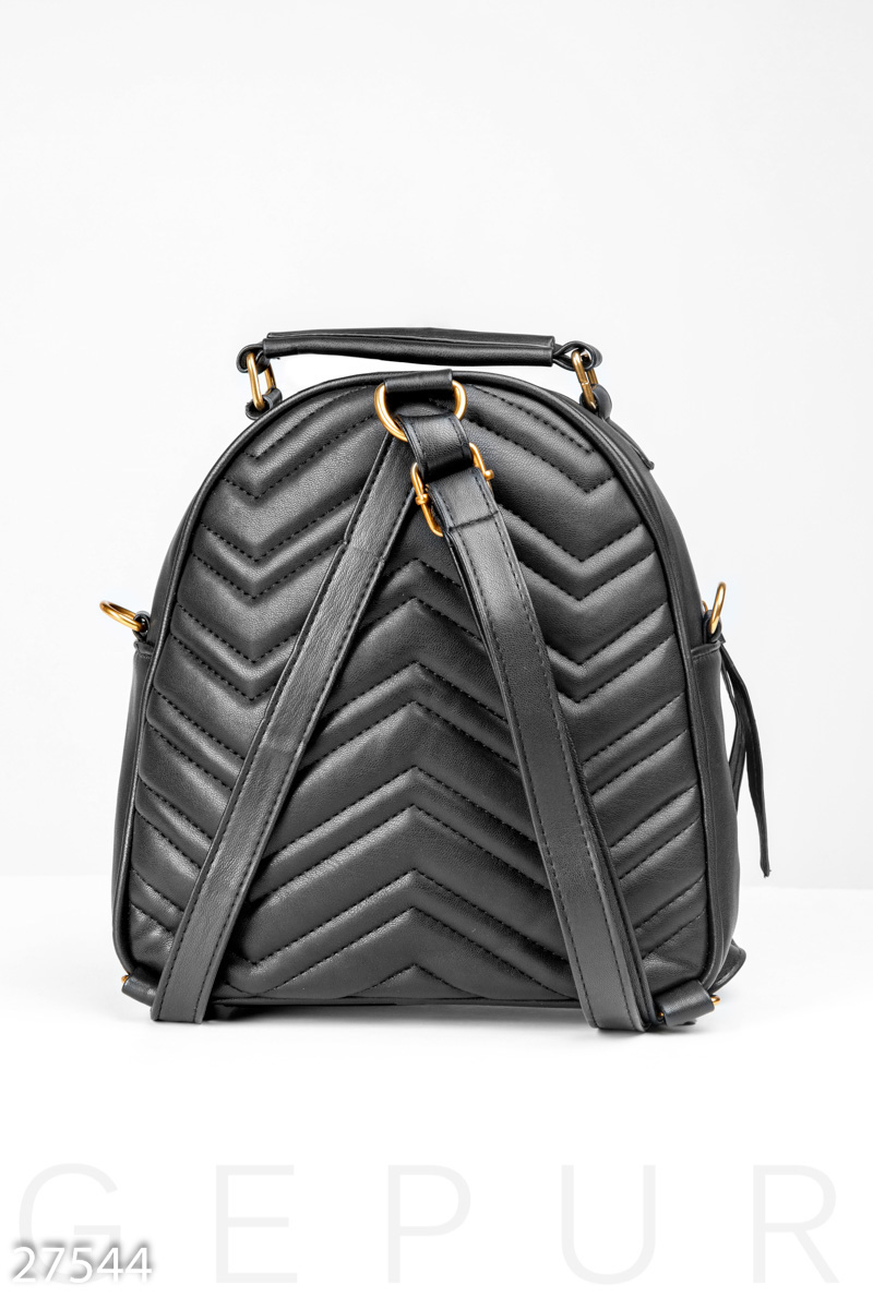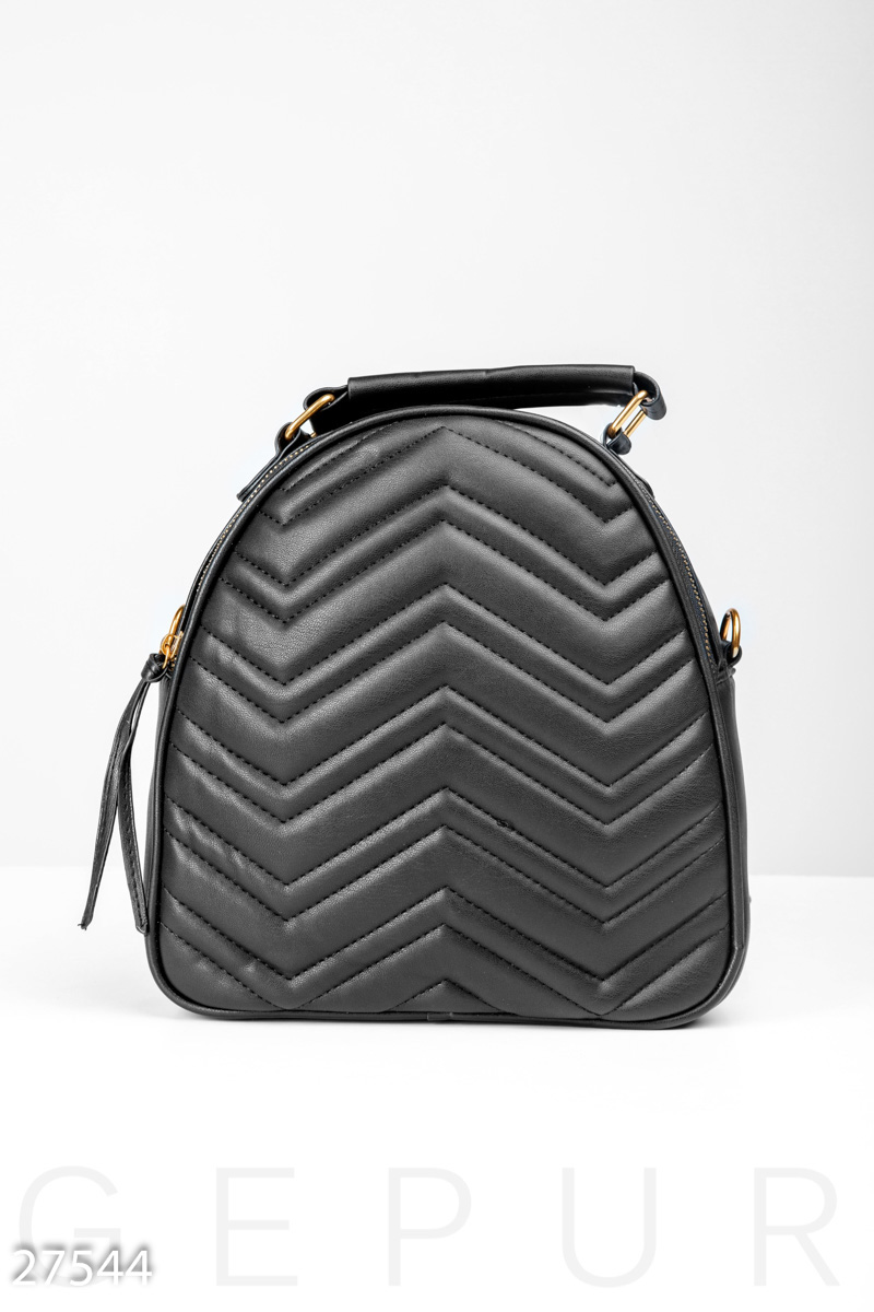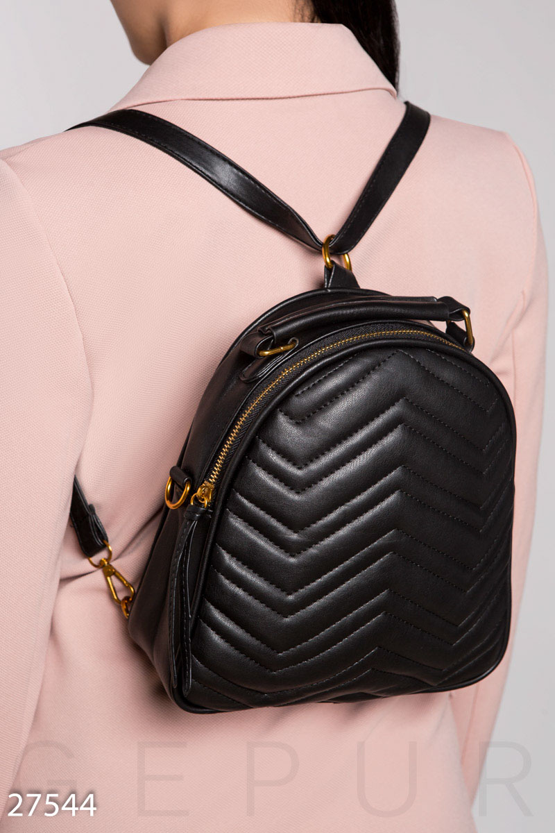 Небольшой женский рюкзак на молнии, выполненный из стеганой эко-кожи. Лямки трансформируются в плечевой ремешок с регулятором длины.