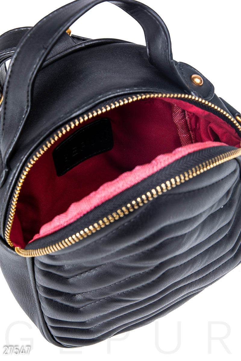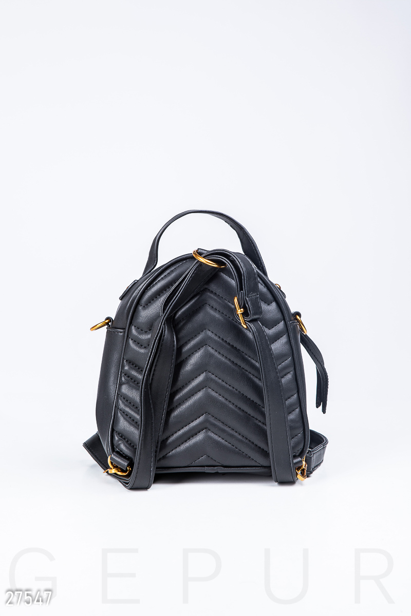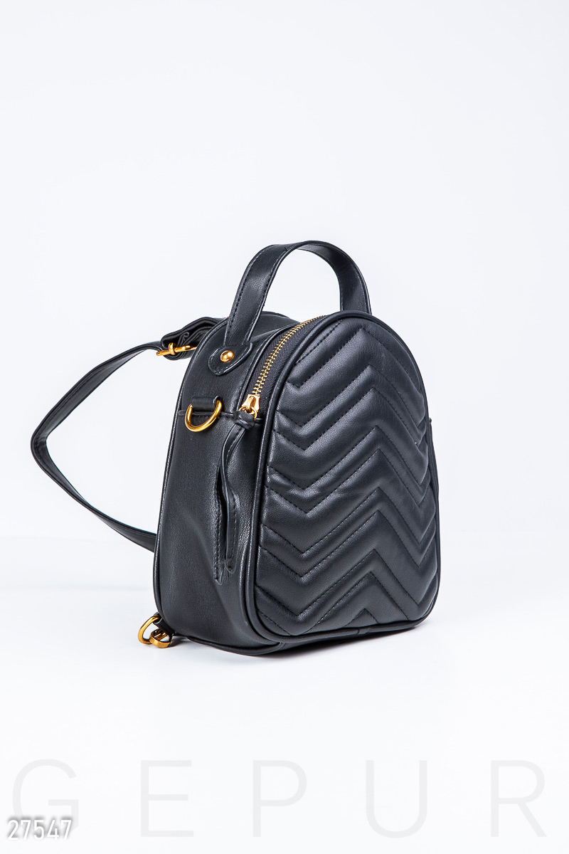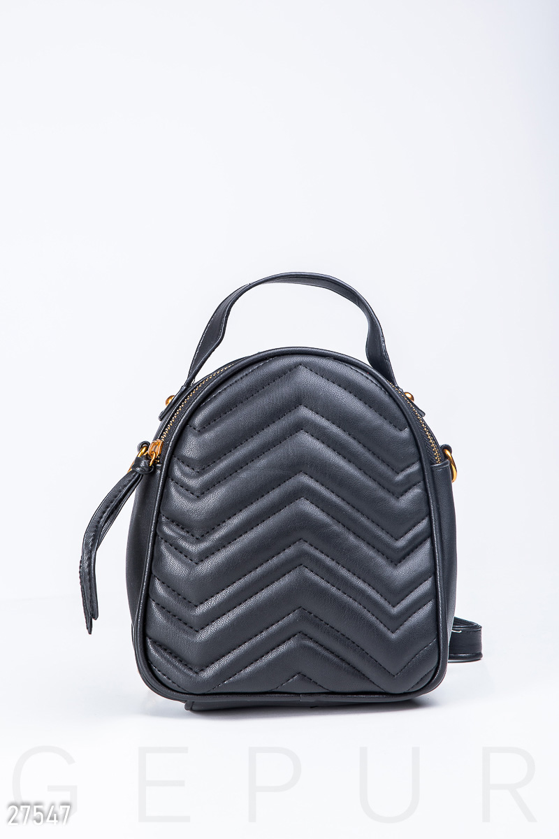 Небольшой городской рюкзак овальной формы с короткой ручкой, съемными регулируемыми лямками, которые трансформируются в плечевой ремешок, и вставками из стеганой эко-кожи.