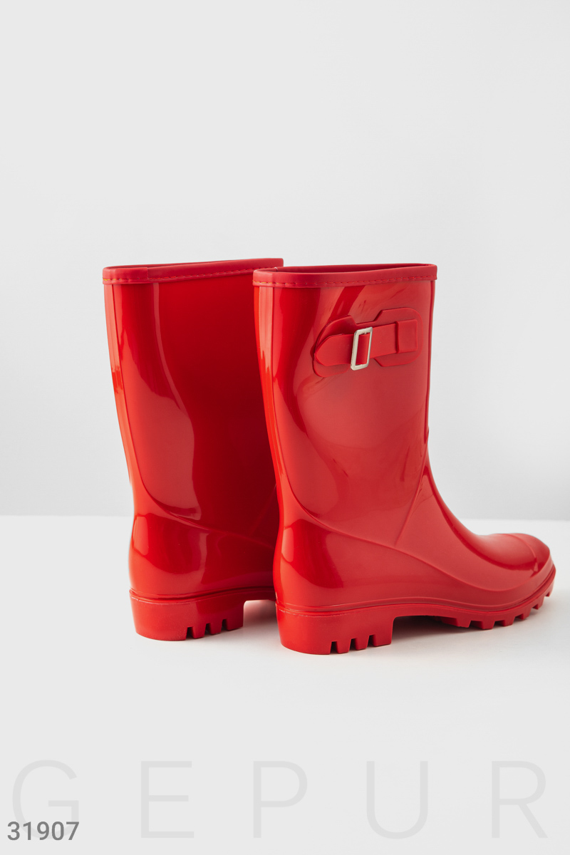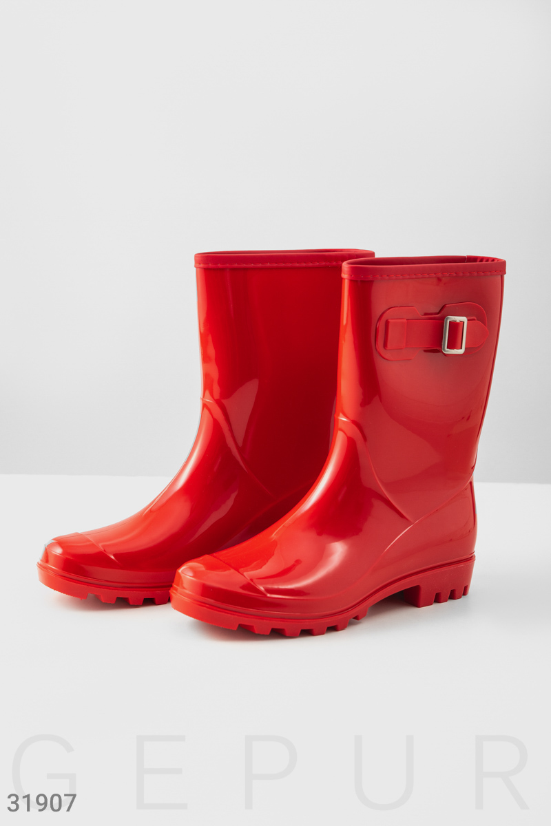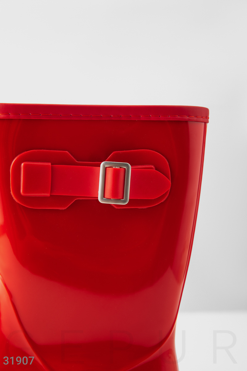 Красные женские сапоги литой конструкции с глянцевой поверхностью, дополненные однотонной декоративной пряжкой.