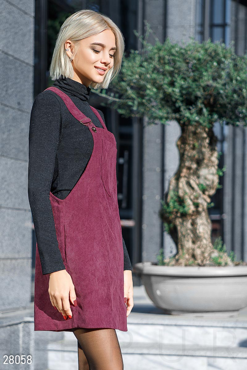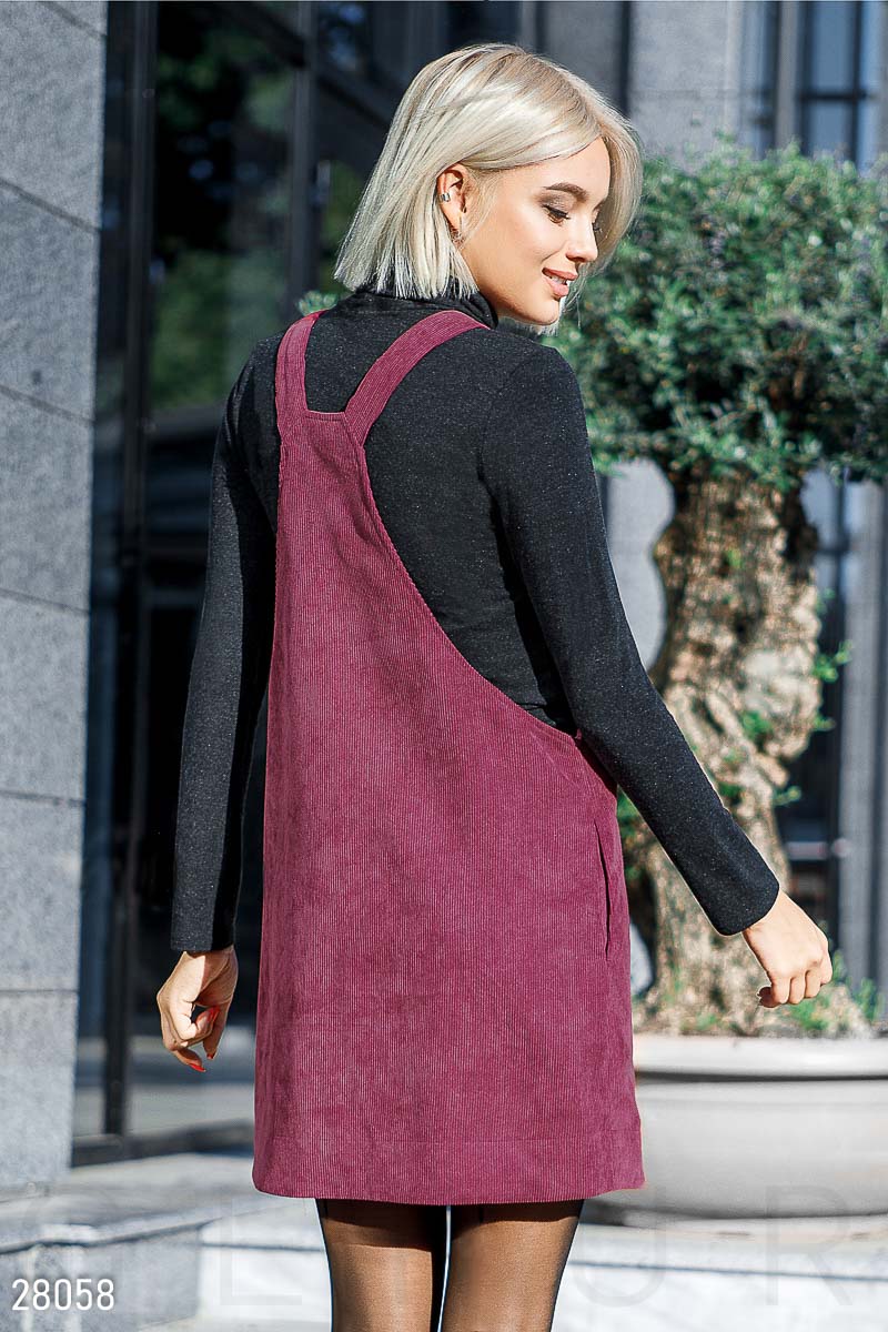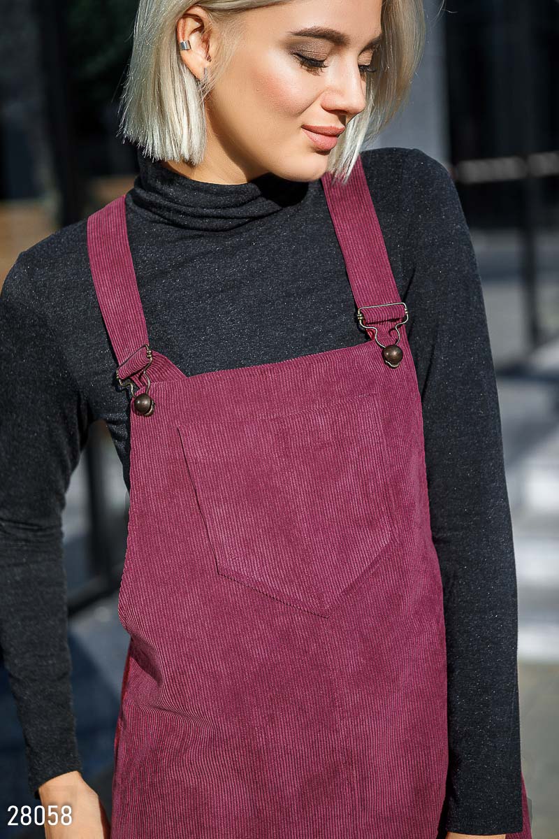 Универсальный женский сарафан свободного кроя, выполненный из мягкого вельвета: удобные лямки с регулятором длины, широкая пройма, два кармана в швах и фигурный накладной карман на груди.