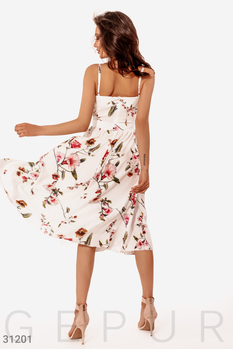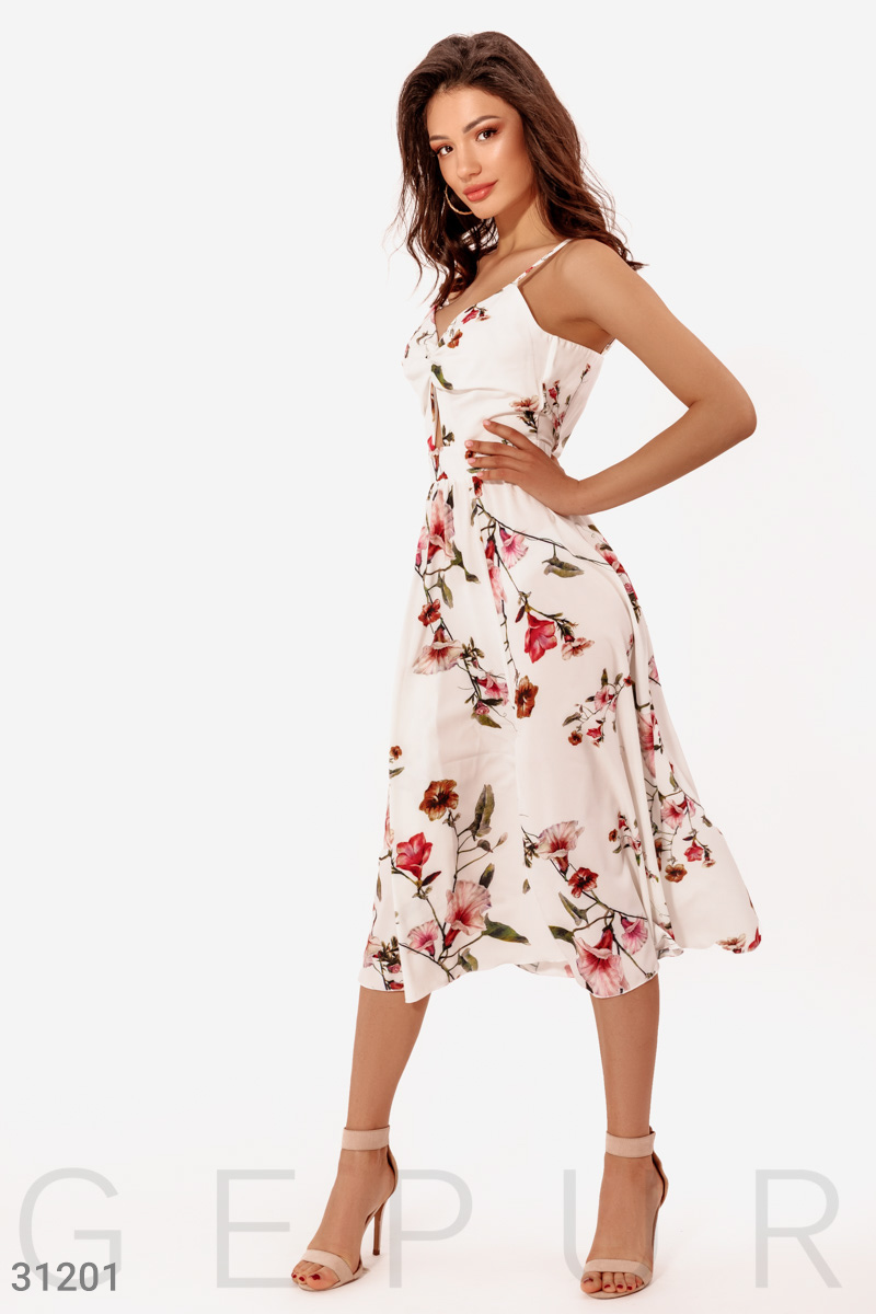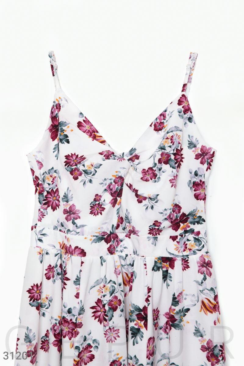 Сарафан-миди на тонких регулируемых бретелях в цветочный принт с небольшим v-образным вырезом и декоративным узлом на груди, втачным поясом и расклешенной юбкой с высоким боковым разрезом.