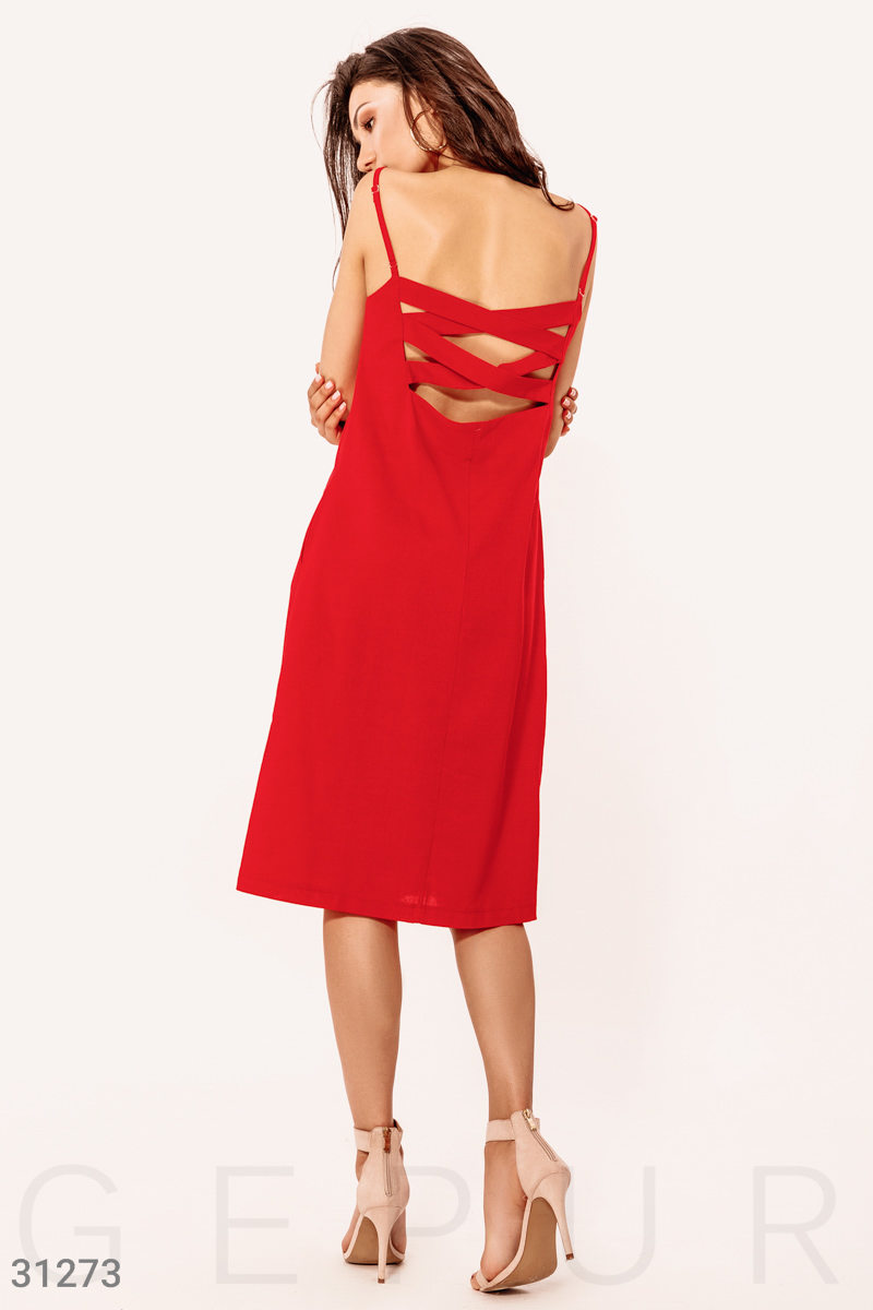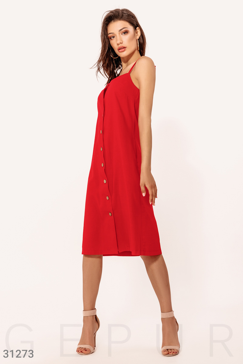 Повседневный приталенный сарафан, выполненный из дышащей ткани: тонкие регулируемые бретели, квадратный вырез, открытая спинка с плетением, планка с пуговицами спереди и два прорезных кармана по бокам.