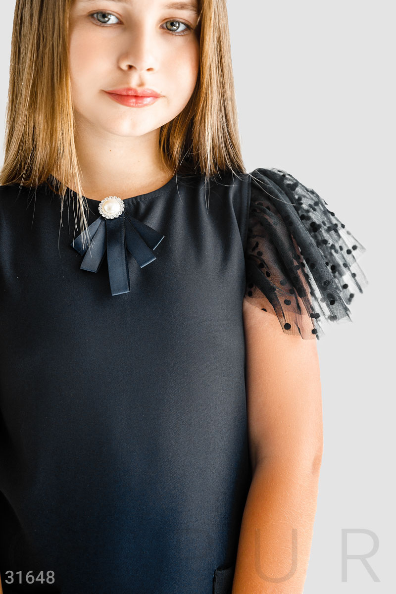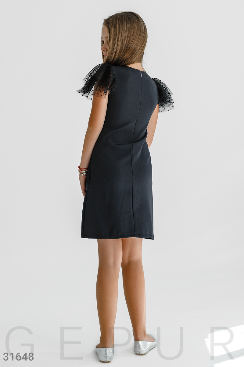 Сарафан а-силуэта с круглым вырезом, рукавами-крылышками из фатина, съемной брошью и двумя накладными карманами спереди.