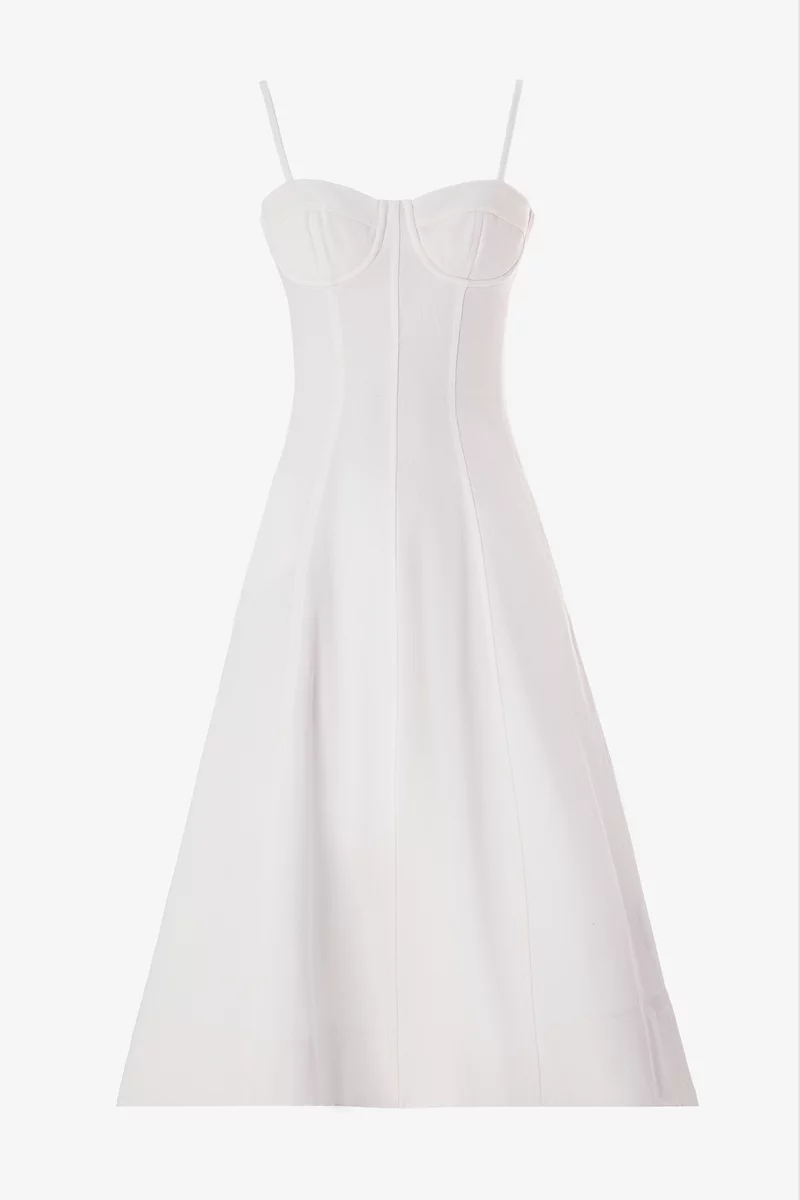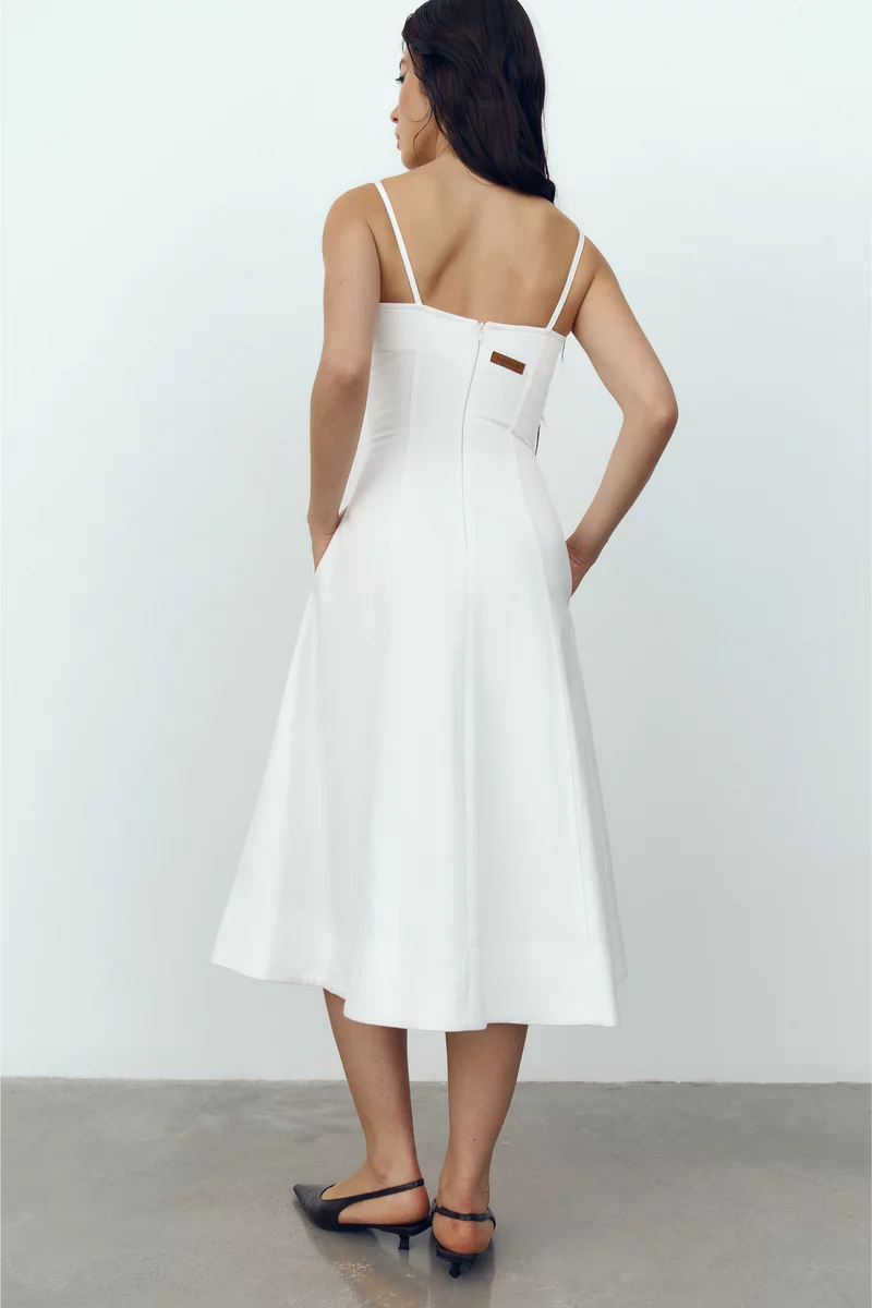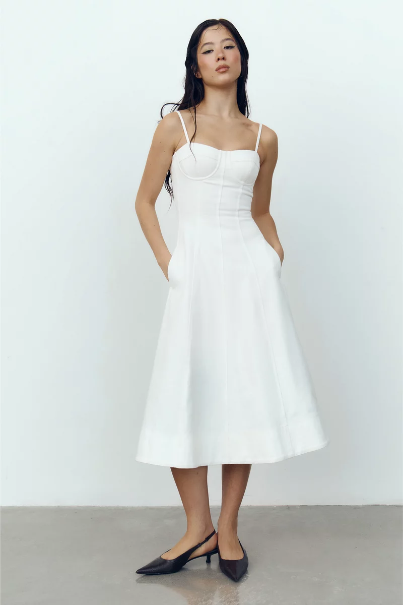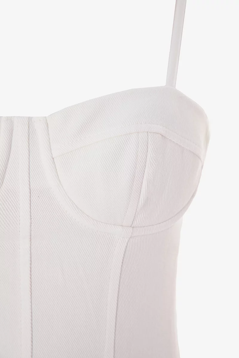 Джинсовый сарафан миди из 100% хлопка. Модель на тонких бретелях, с акцентным корсетным лифом и юбкой клеш. Застёгивается на скрытую молнию сзади
