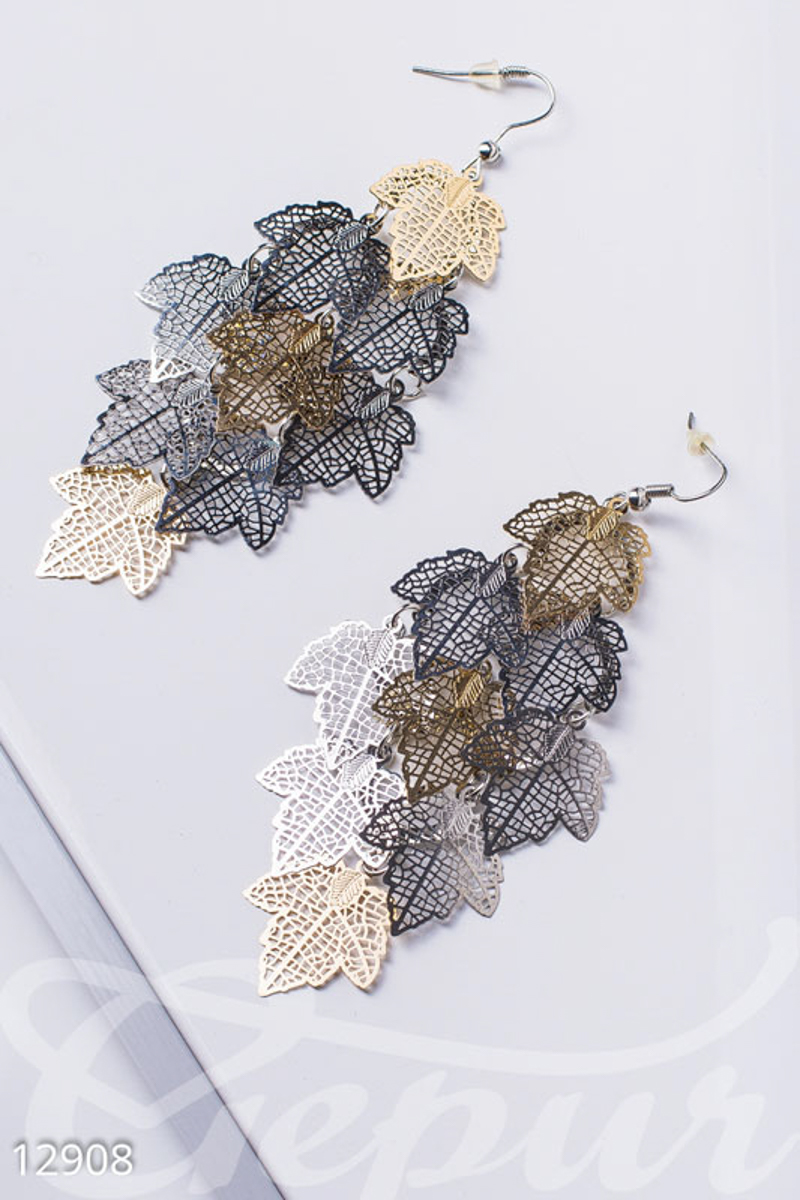 Элегантные удлиненные серьги выполнены из тонких металлических пластин в виде листиков разных оттенков, которые крепятся как подвески к общему стержню. Такие сережки прекрасно дополнят расслабленный повседневный образ и подойдут ярким и жизнерадостным девушкам.