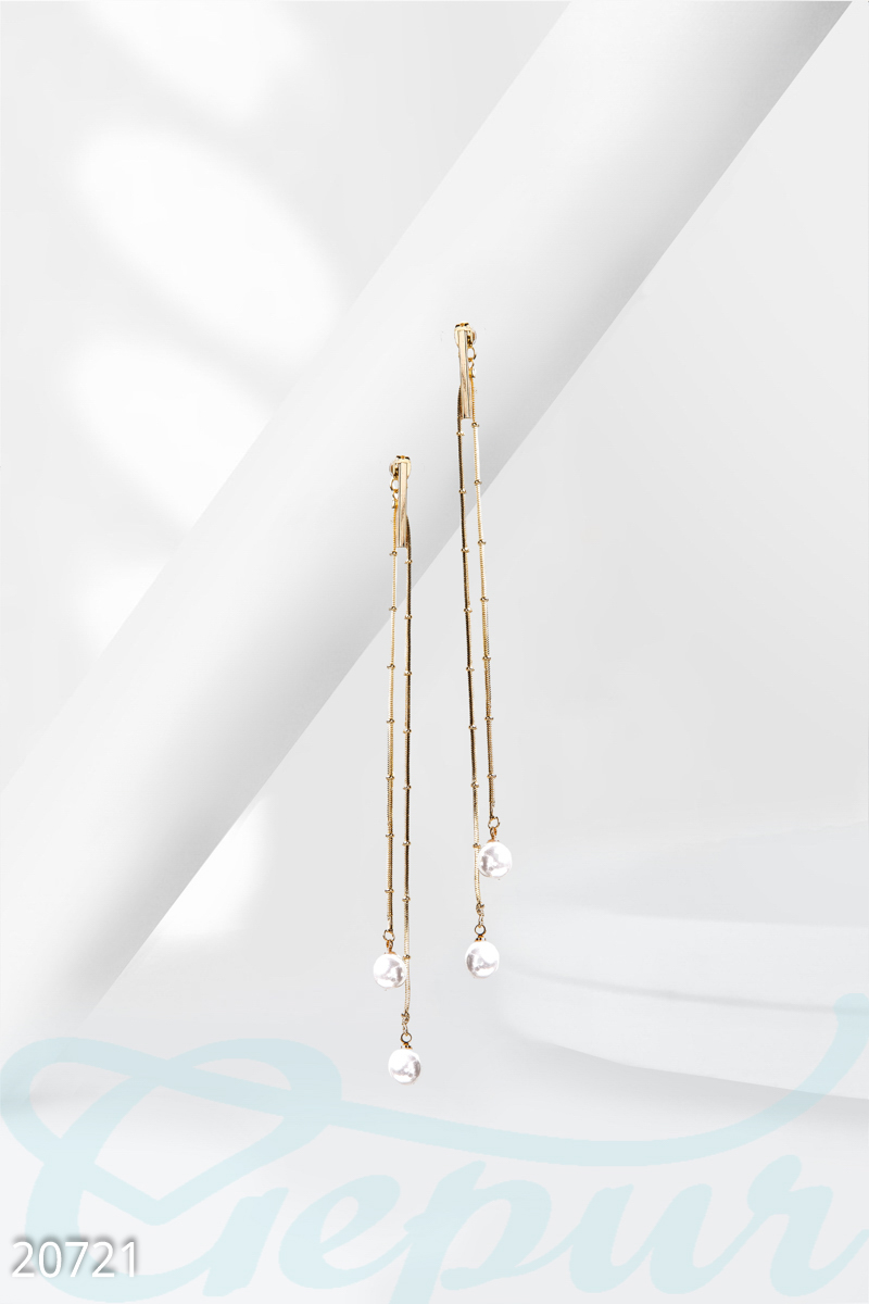 Серьги с длинной асимметричной цепочкой, которая инструктирована внизу искусственным жемчугом.