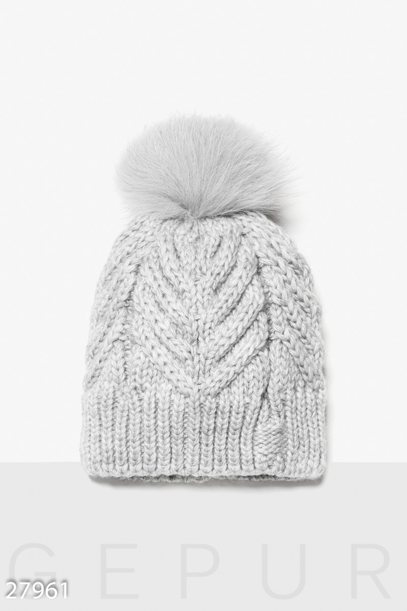 Теплая зимняя шапка фигурной вязки, дополненная помпоном из эко-меха.