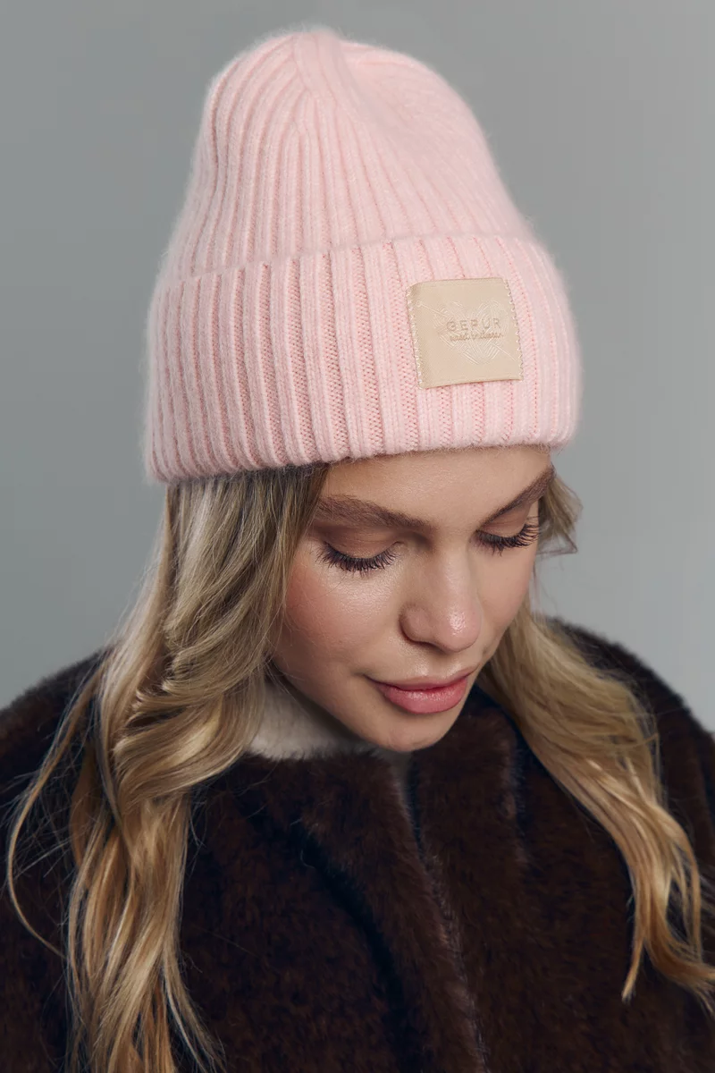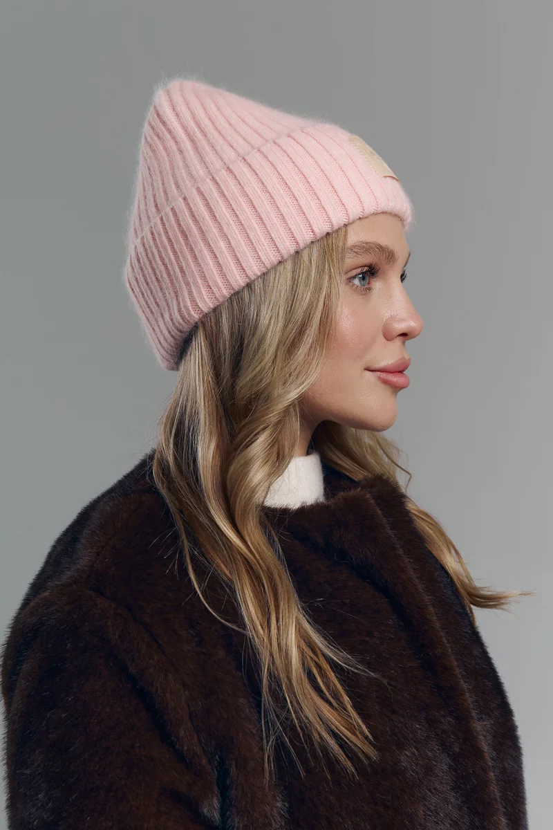 Розовая ангоровая шапка с отворотом