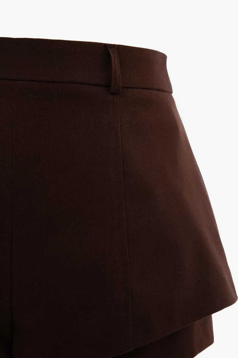 Короткие шорты из костюмной ткани. Модель с эффектом многослойности. Шорты застегиваются на скрытую молнию сзади. На подкладке