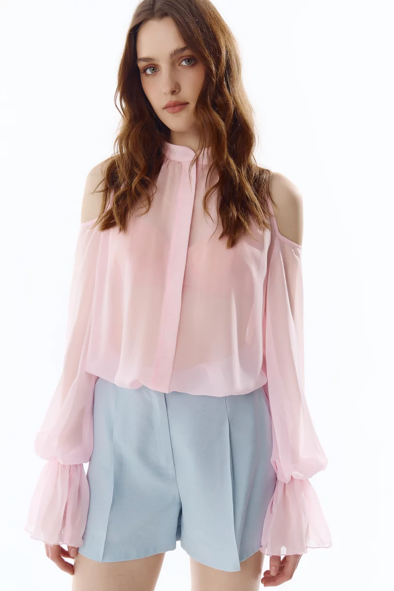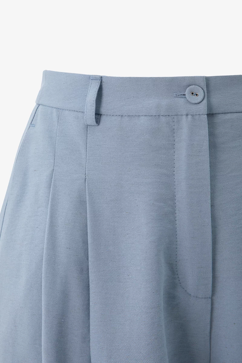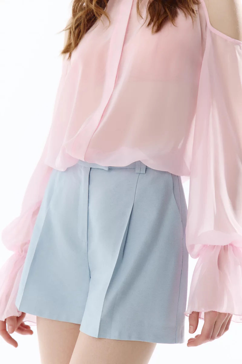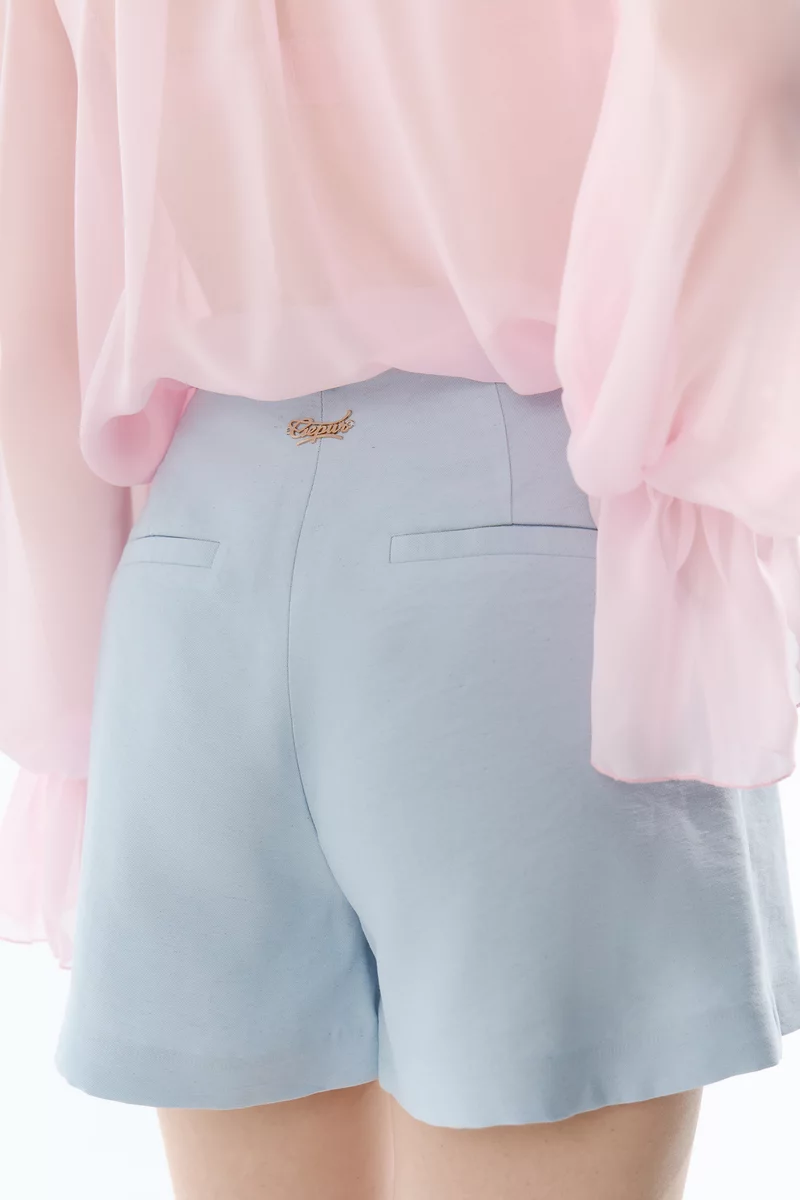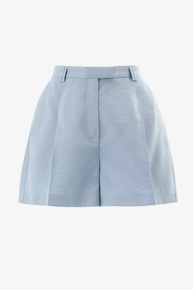 Короткие шорты выполнены из костюмной ткани с добавлением льна. Модель с боковыми карманами. Застегиваются на пуговицу и скрытую молнию спереди. Высокая посадка эффектно моделирует силуэт