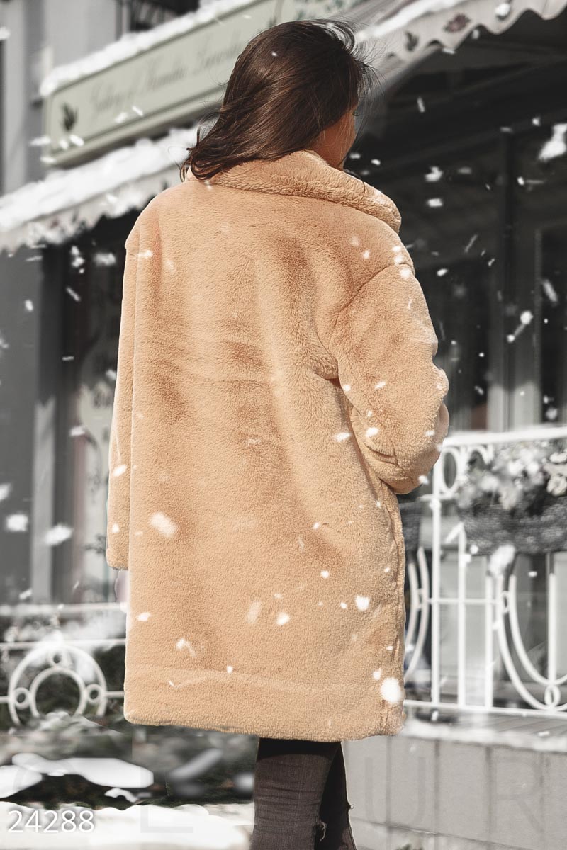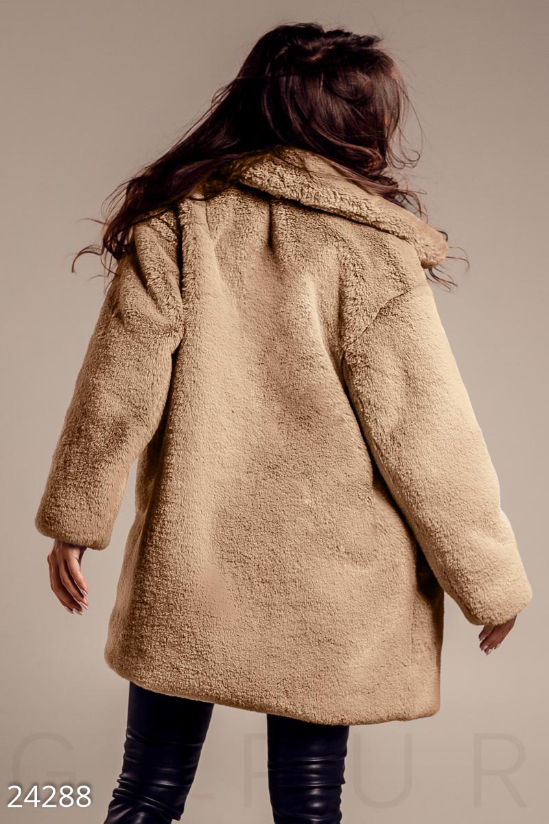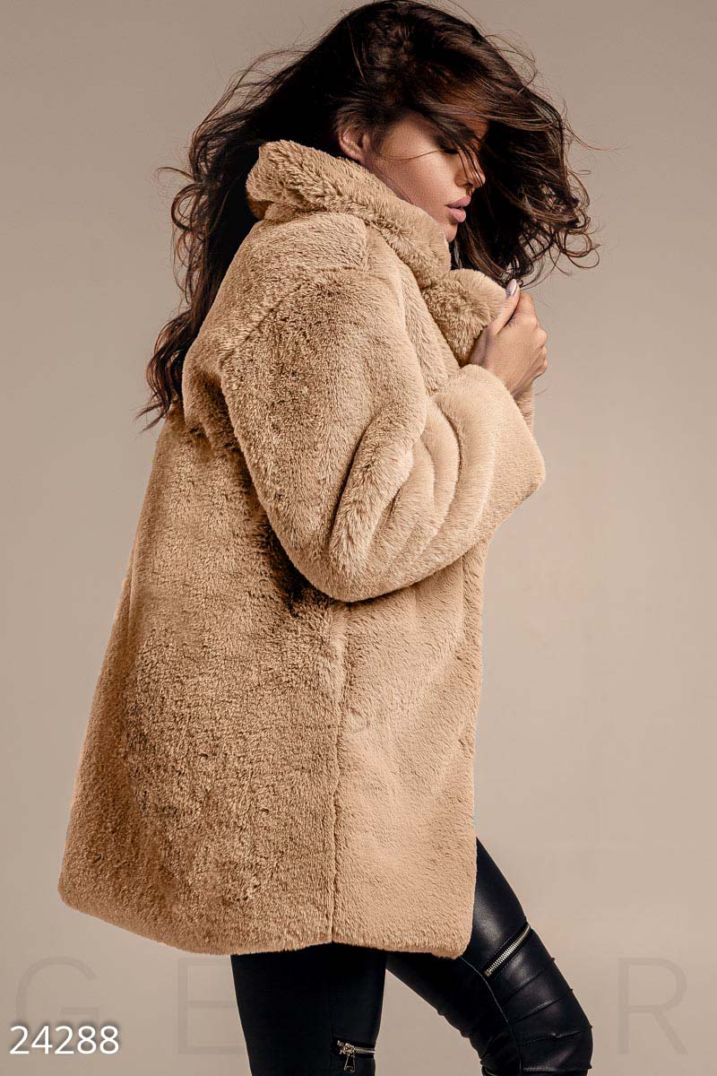 Теплое меховое пальто от дизайнеров Gepur, выполненное из мягкого эко-меха premium класса: прямой крой, высокий воротник-стойка и два небольших кармана в швах.