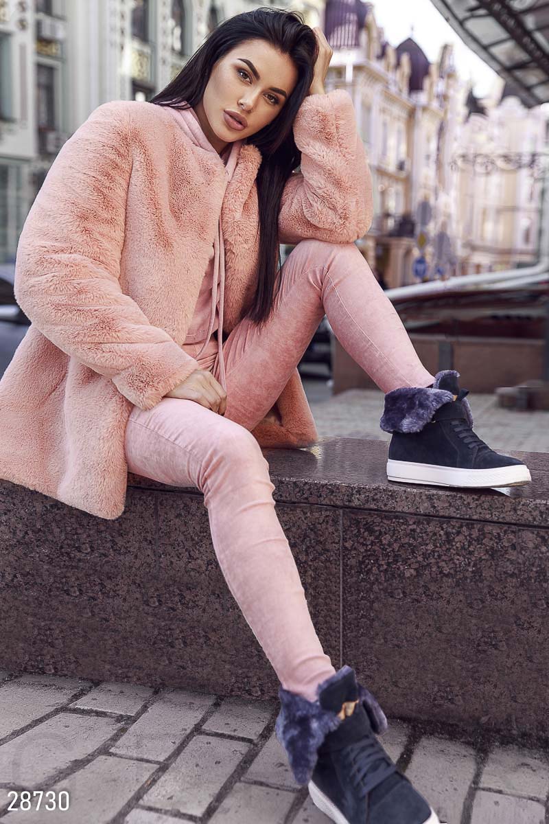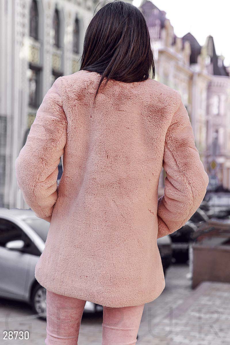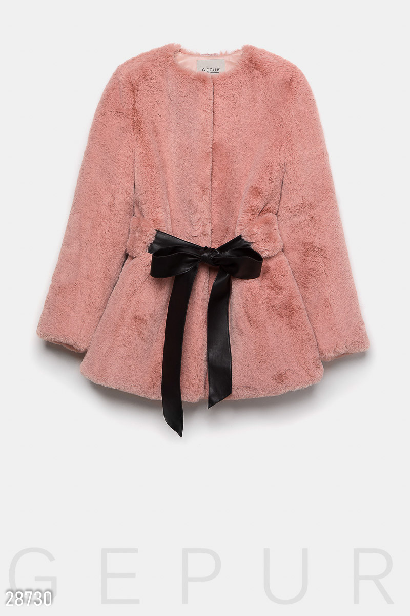 Оригинальная шуба от дизайнеров Gepur, выполненная из эко-меха premium класса: небольшой круглый вырез, два прорезных кармана и съемный пояс-оби со вставками из эко-кожи.