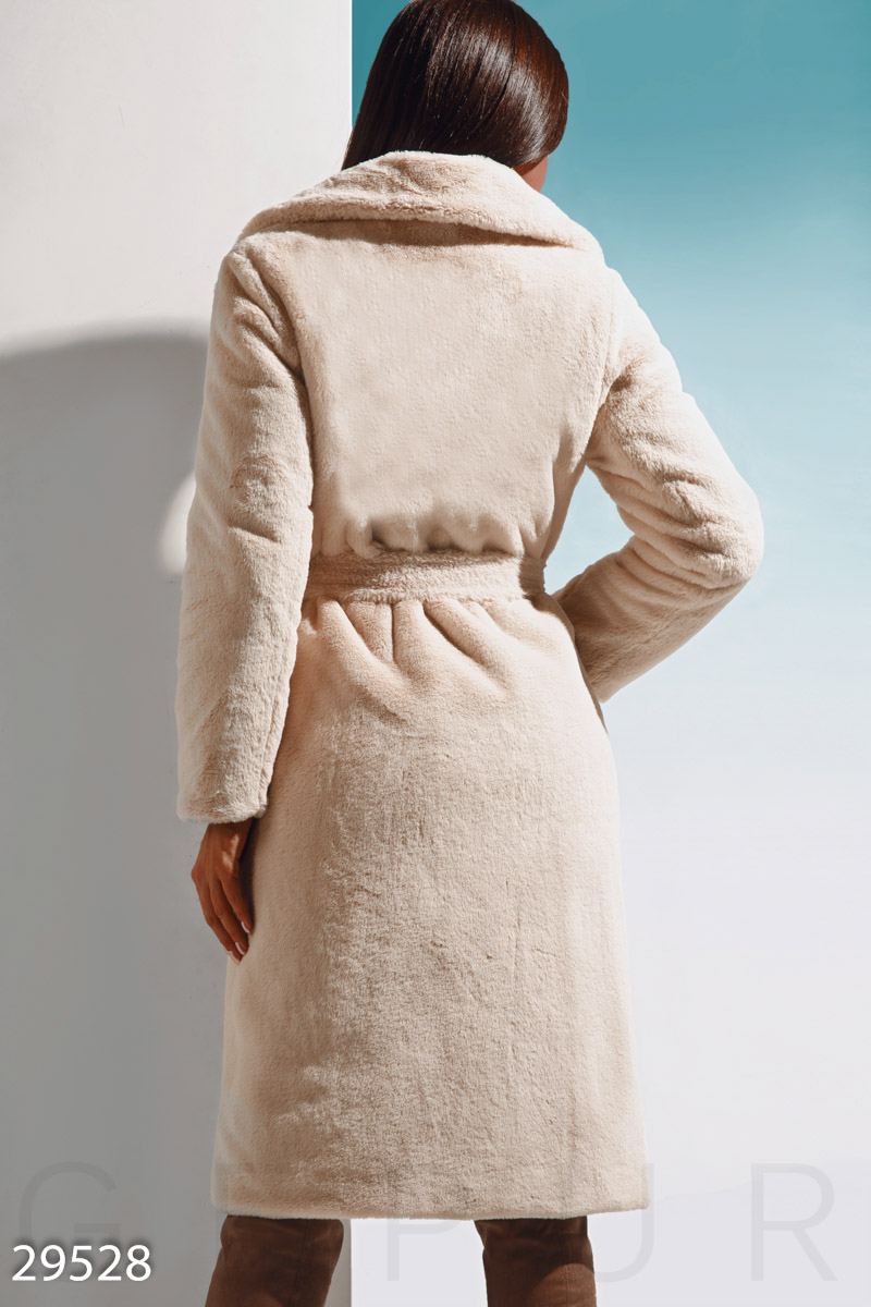 Теплая шуба Gepur, выполненная из цветного эко-меха premium класса: отложной воротник с лацканами, два горизонтальных кармана в швах и съемный пояс в тон.